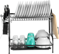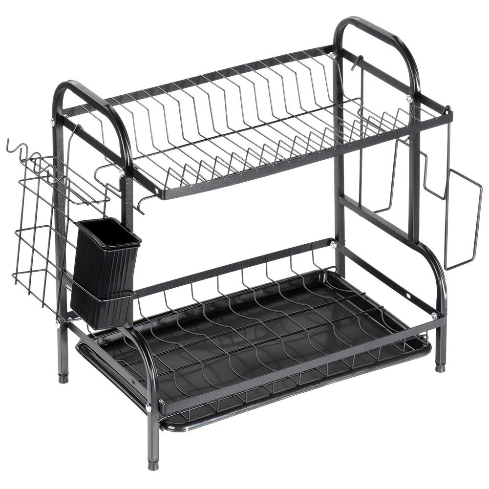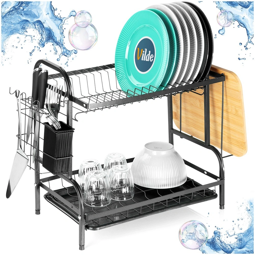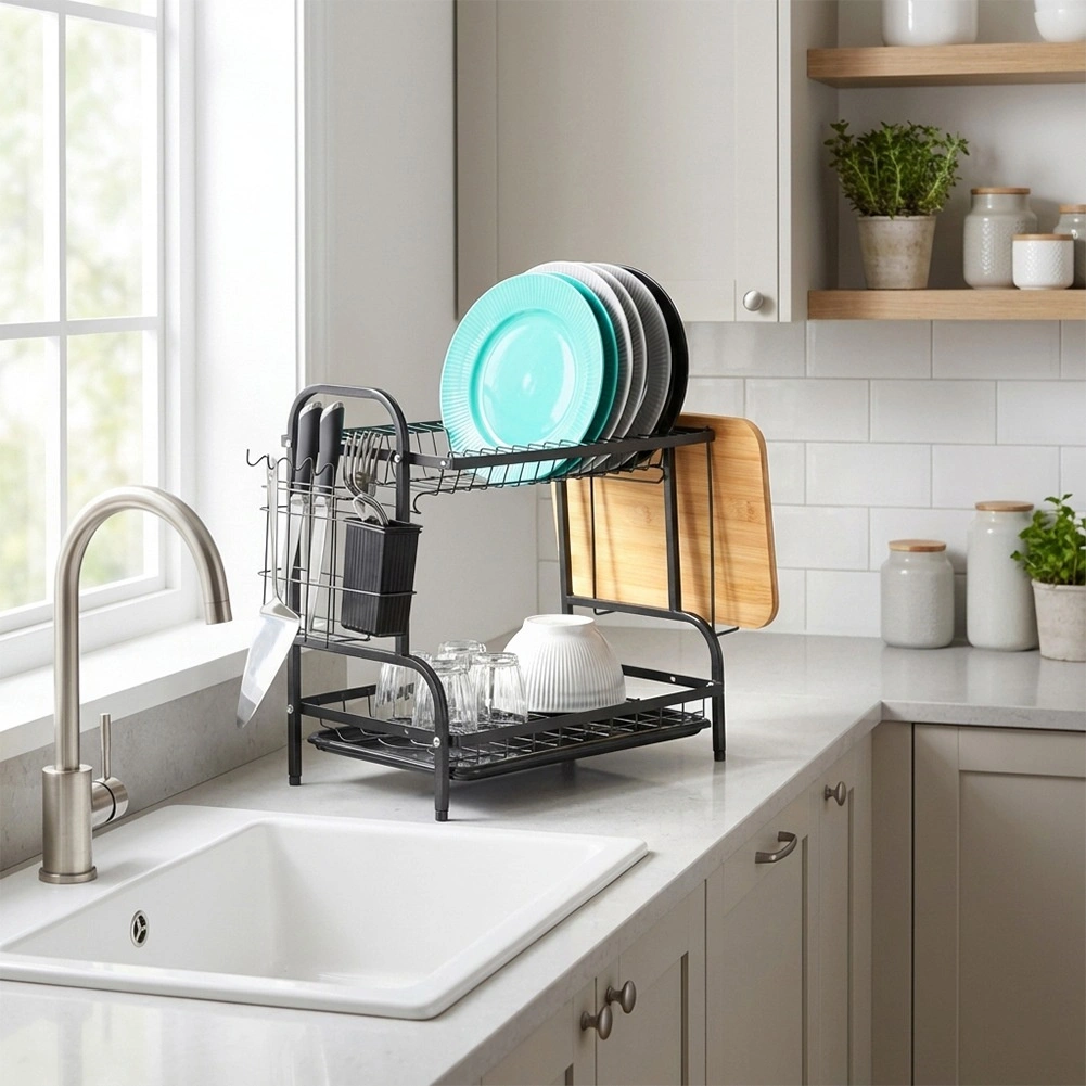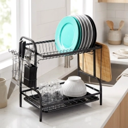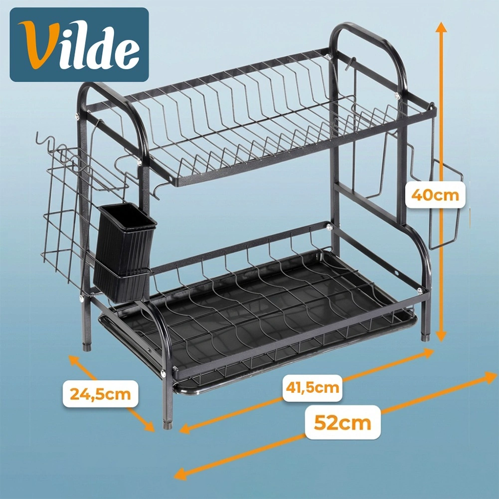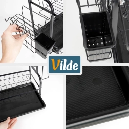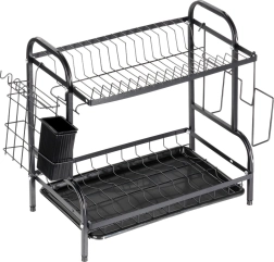 Construcția robustă din metal, cu finisaj negru mat, este rezistentă și ușor de întreținut. Tava de scurgere inferioară din plastic colectează apa și protejează blatul bucătăriei de pete. Întregul ansamblu este ideal pentru bucătării mai mici și gospodării care doresc vase mereu bine organizate.