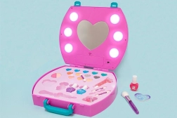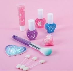Conține un etui cosmetic cu lumină și oglindă, 12 farduri de pleoape în culori diferite, 3 pensule pentru fardul de pleoape, 2 farduri de obraz, o pensulă pentru fardul de obraz, 3 lacuri de unghii în culori diferite, un luciu de buze, un balsam de buze, o pilă de unghii și instrucțiuni. Potrivit pentru copii de la 8 ani.