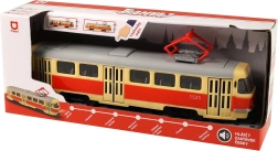 Tramvai roșu-alb anunță stațiile în limba cehă, astfel încât toți călătorii știu când trebuie să coboare. Tramvaiul anunță 7 stații: Gara principală, Aquapark, Grădina Zoologică, Stadion sportiv, Școală primară și grădiniță, Teatru, Centru comercial. Ușile se deschid manual, iar ca un detaliu reușit în plus, după deschidere interiorul se luminează în albastru. De fiecare dată când ușile se deschid, se aude un anunț, iar la închidere clipesc chiar farurile din față. Tramvaiul spațios este fabricat din plastic și se deplasează liber (freewheel). Așadar, poftiți la bord, începe o călătorie plină de distracție!