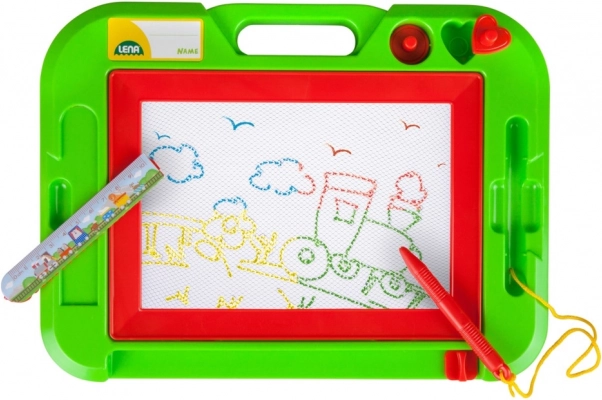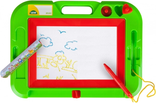 Tabla magnetică de desen pentru copii de la LENA susține creativitatea și motricitatea fină. Include o stilou/creion pe șnur, 2 ștampile magnetice și o bară pentru ștergere rapidă, datorită căreia copiii pot începe ușor să deseneze din nou. La scrierea cu vârful metalic, suprafața colorată se schimbă și creează imagini vii.
