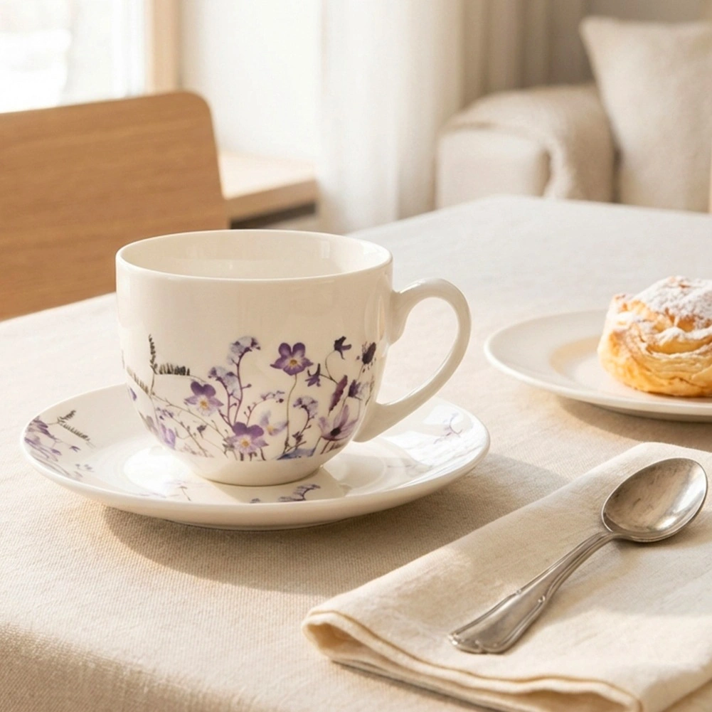 Forma practică, cu mâner ergonomic, asigură o băutură confortabilă, în timp ce farfurioara oferă o bază stabilă și elegantă. Porțelanul de calitate este rezistent la utilizarea zilnică și permite întreținere ușoară în mașina de spălat vase și încălzire rapidă în cuptorul cu microunde.