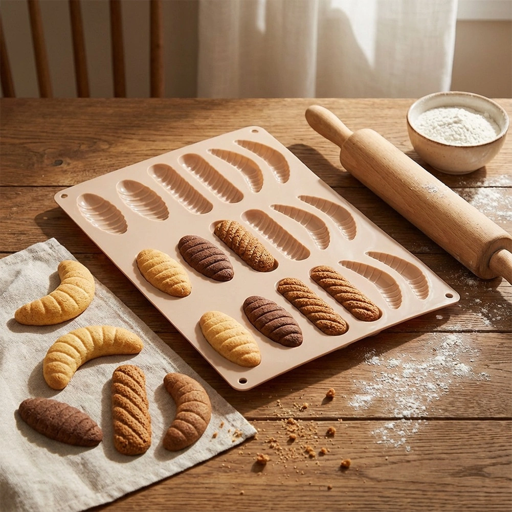Forma cu mai multe cavități permite coacerea sau turnarea a 18 biscuiți ori praline într-o singură tranșă – ideal pentru o pregătire rapidă și uniformă.
