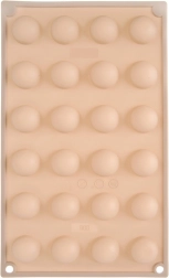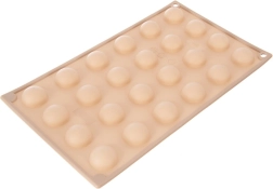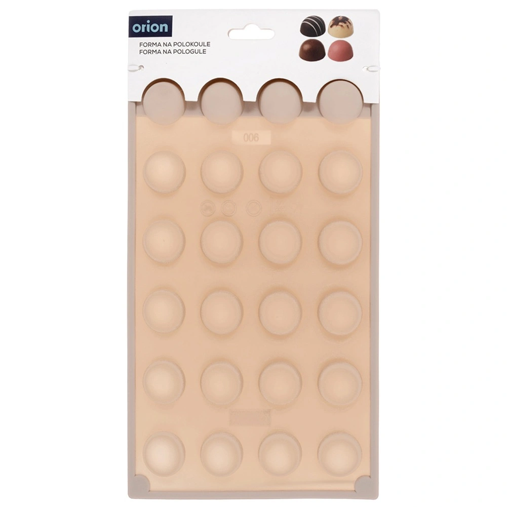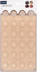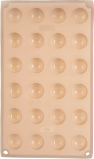 Această formă din silicon, de culoare bej, permite realizarea rapidă și ușoară a pralinelor, ciocolățelelor și mini-tortulețelor cu aspect profesional în formă de semisferă. Datorită suprafeței antiaderente, piesele finite se scot ușor fără să se lipească, iar forma nu absoarbe mirosuri sau gusturi.