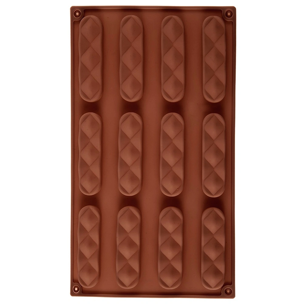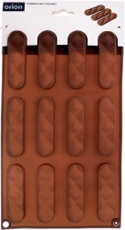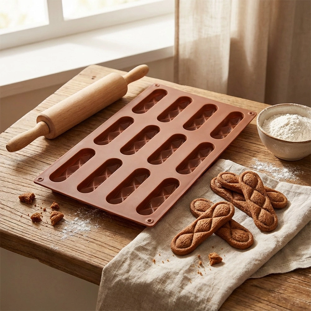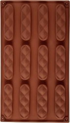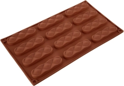 Forma are douăsprezece cavități alungite cu model decorativ, datorită cărora veți crea biscuiți sau praline uniforme și estetice într-o singură tranșă.