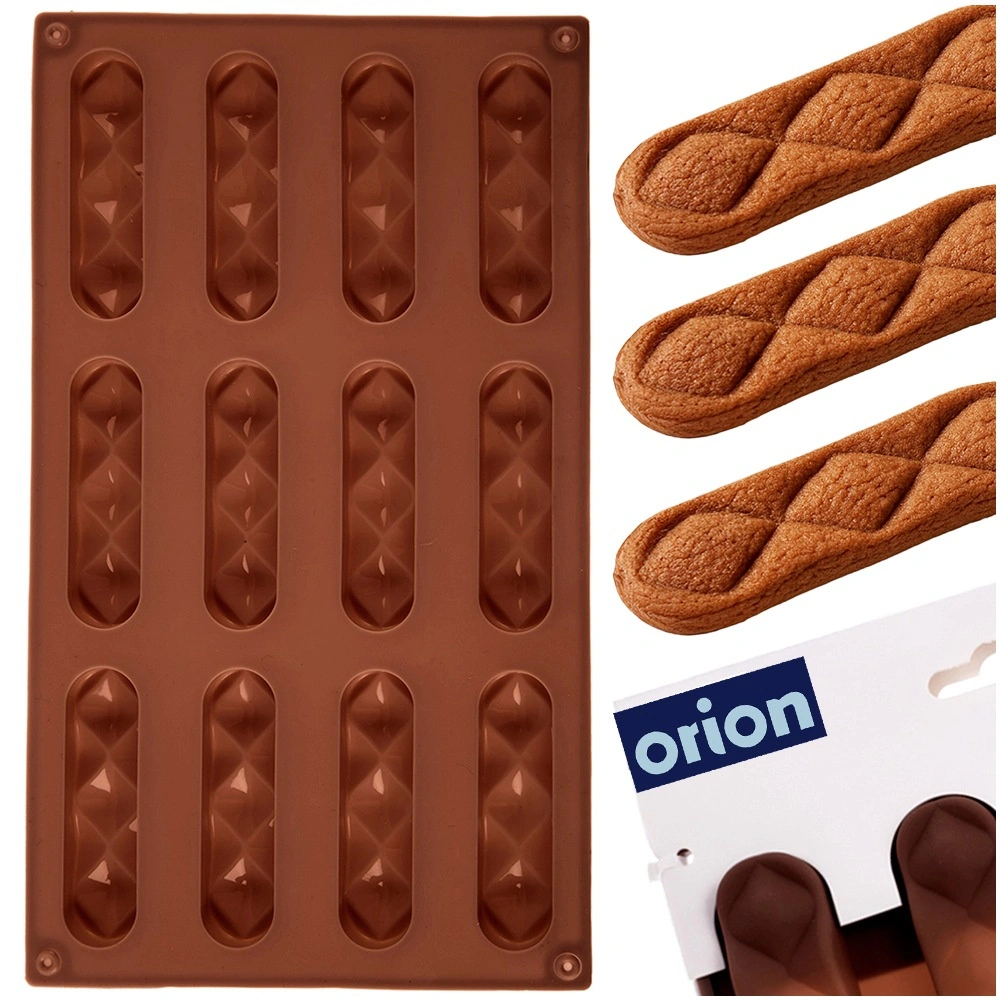 Cu această formă din silicon de calitate veți prepara biscuiți fragezi și praline de casă în formă elegantă alungită. O porție cuprinde 12 bucăți cu dimensiunea de aproximativ 8 × 2 × 1 cm, care, datorită suprafeței antiaderente, se scot ușor fără a se rupe. Forma asigură coacere uniformă și un decor frumos cu model de diamant.