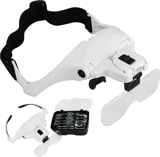 Lupă frontală practică, tip ochelari, cu două LED-uri pentru iluminarea clară a detaliilor. Oferă 5 lentile interschimbabile cu măriri diferite și unghi ajustabil atât pentru iluminare, cât și pentru lentile. Ideală pentru ceasornicari, electroniști, machetiști și lucrări fine ce necesită precizie.