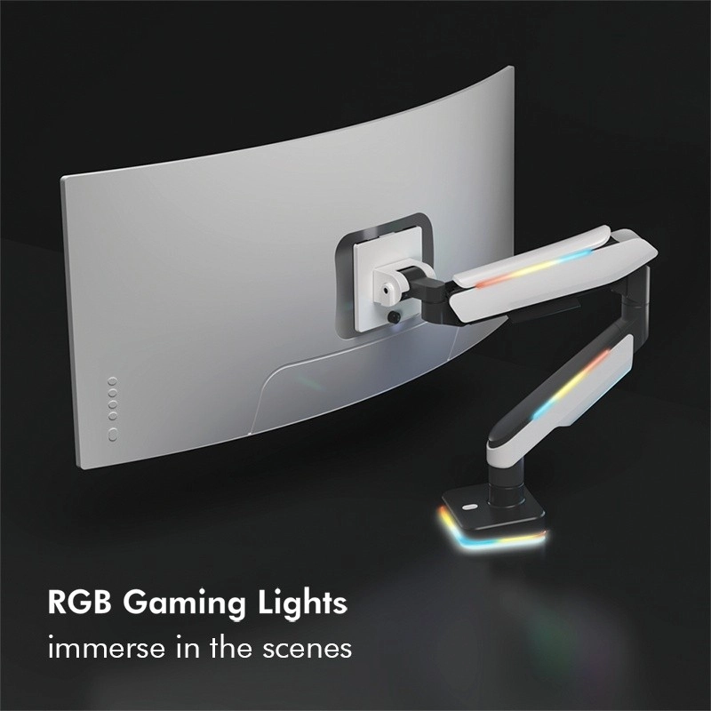 Arcul pneumatic al suportului asigură o mișcare ușoară și precisă a monitorului cu o singură mână. Poți roti, înclina și pivota ecranul după necesități – de la lucru până la gaming. Efectul de iluminare integrat accentuează atmosfera colțului tău de gaming și unifică aspectul ansamblului.