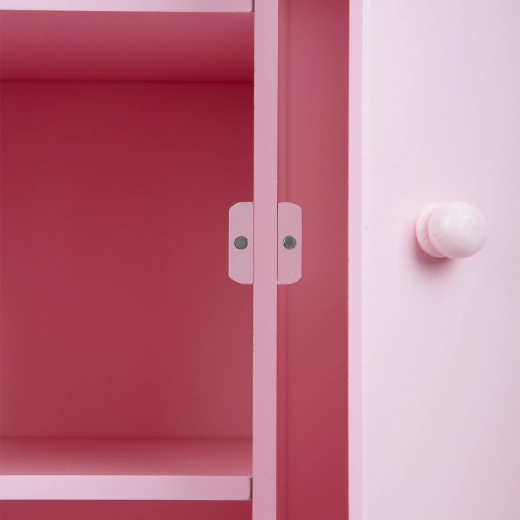 Acest dulăpior din lemn de calitate, într-o nuanță delicată de roz, este ideal pentru depozitarea ordonată a hainelor și accesoriilor păpușilor. Partea stângă oferă două rafturi practice, iar partea dreaptă este dotată cu o bară pentru umerașe pentru rochițe. Ușițele cu închidere magnetică se manevrează ușor, iar decupajele în formă de stea și lună conferă mobilierului un aspect atrăgător.