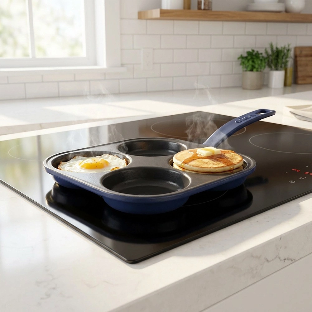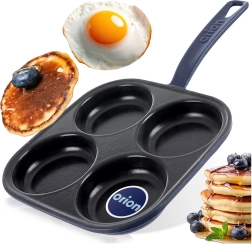 Patru cupe rotunde (Ø 9 cm) mențin ouăle și aluatul exact la locul lor – ideale pentru clătite mici și ouă ochi fără efort.