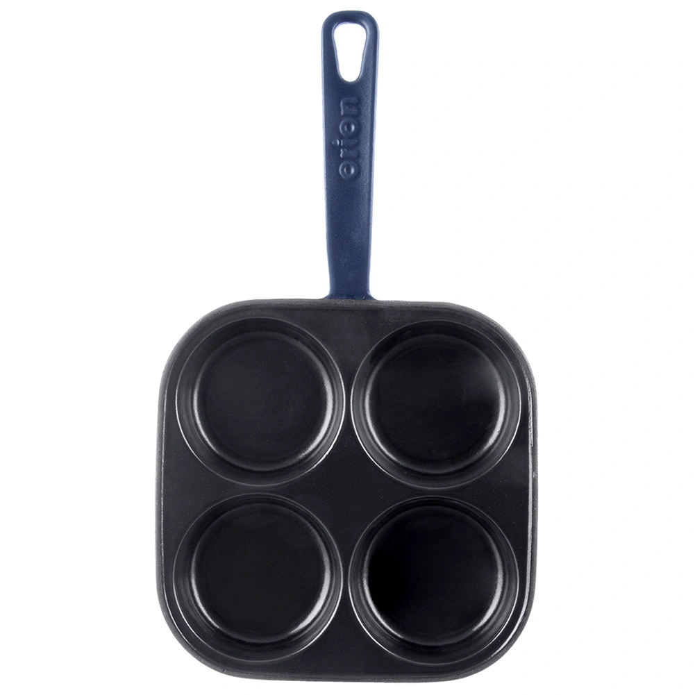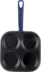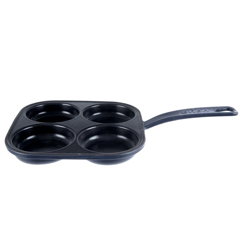 Tigaie pătrată din fontă, cu dimensiuni de 20,5 × 20,5 cm și patru cupe separate (Ø 9 cm), pentru prepararea rapidă a ouălor, clătitelor mici și mini pancakes în formă perfectă. Suprafața emailată de culoare neagră minimizează lipirea și ușurează servirea, iar exteriorul și mânerul în nuanță de albastru oferă tigăii un aspect elegant.