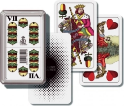 Joc de cărți clasic mariáš cu cărți cu două fețe, ideal pentru întâlniri prietenoase și distracție. Jocul este livrat într-o cutie de plastic practică pentru transport ușor.