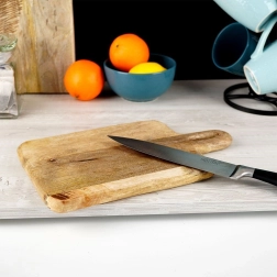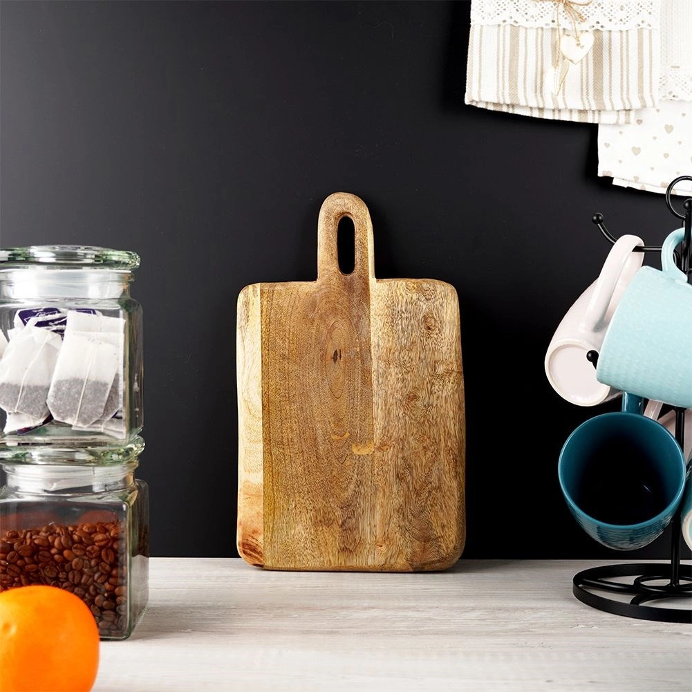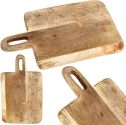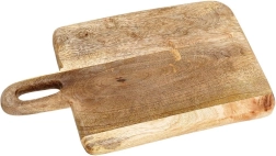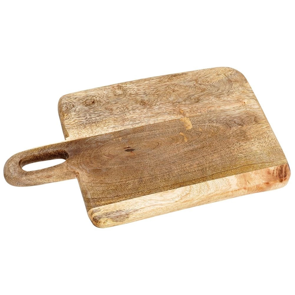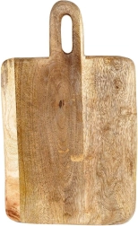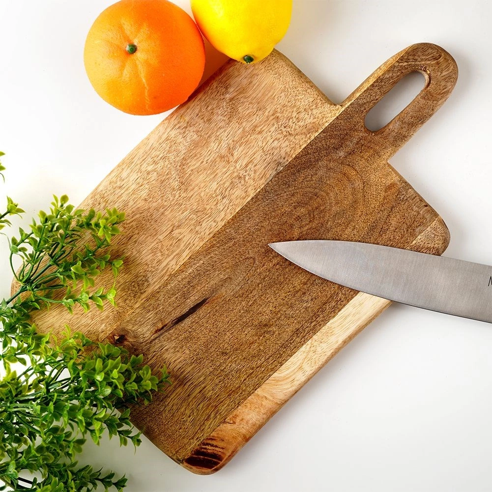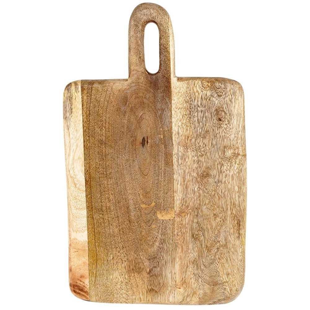 Tocător din lemn de mango, stilat, cu dimensiuni de 33 × 20 × 2 cm, ideal pentru utilizare zilnică în bucătărie. Oferă o suprafață de lucru solidă și rezistentă pentru tăierea cărnii, legumelor și fructelor și este potrivit și pentru servirea brânzeturilor, mezelurilor și gustărilor. Datorită mânerului practic se transportă și se agață ușor. Lemnul de mango este ecologic, sigur pentru contactul cu alimentele, se usucă rapid și nu absoarbe mirosurile. Aspectul rustic oferă bucătăriei un look decorativ.