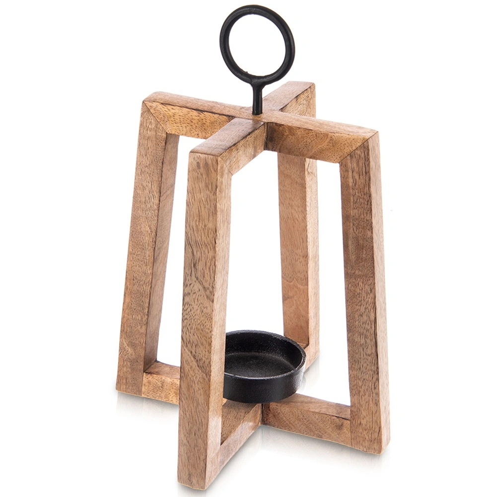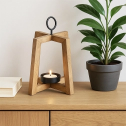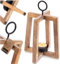 Sfeșnicul cu cadru deschis se remarcă prin nuanța caldă și textura lemnului de mango. Completează perfect interioarele moderne, scandinave sau rustice și, datorită inelului metalic, poate fi ușor agățat la intrare, pe balcon sau pe terasă.