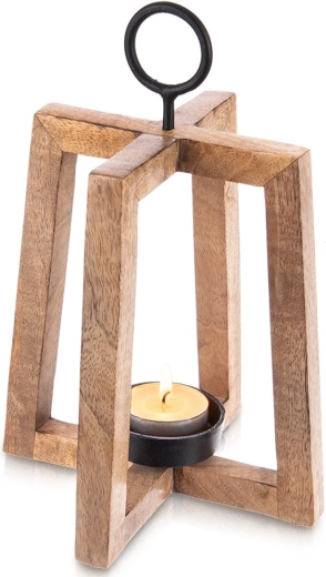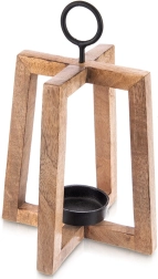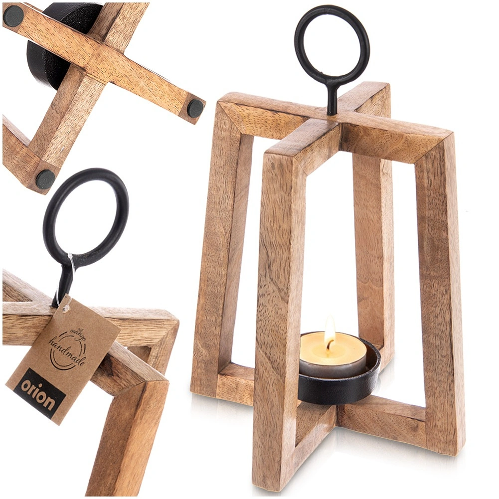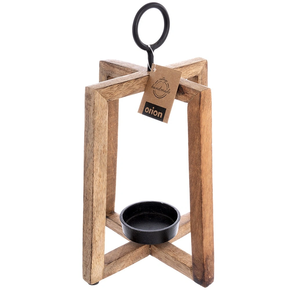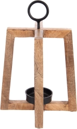 Sfeșnicul din lemn de mango cu structură deschisă aduce lumină ambientală plăcută și oferă interiorului și terasei un farmec natural. Suportul metalic permite agățarea și transportul ușor, iar cupa metalică ține în siguranță lumânarea/tealight-ul cu diametrul de până la 6 cm, în timp ce tampoanele din fetru asigură stabilitate și protecția suprafeței. Dimensiuni 18 × 18 × 27,5 cm.
