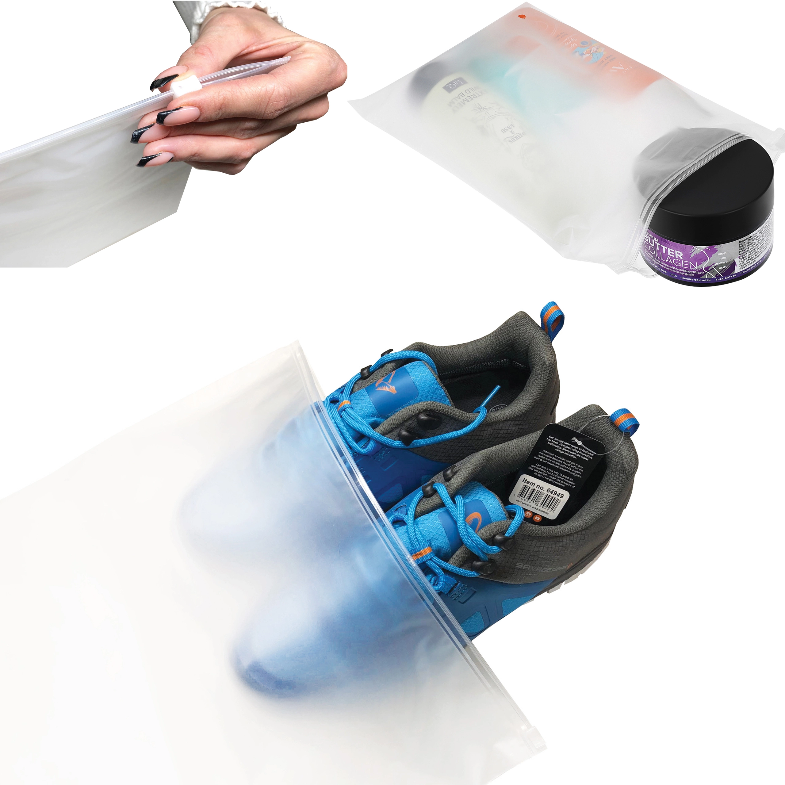 Datorită deschiderii mari și materialului flexibil, împachetați ușor cosmetice, articole de toaletă, documente, cabluri, precum și obiecte mai mari, cum ar fi încălțămintea ușoară. Pungile sunt ușoare, reutilizabile și potrivite pentru valiză, rucsac, baie și birou.