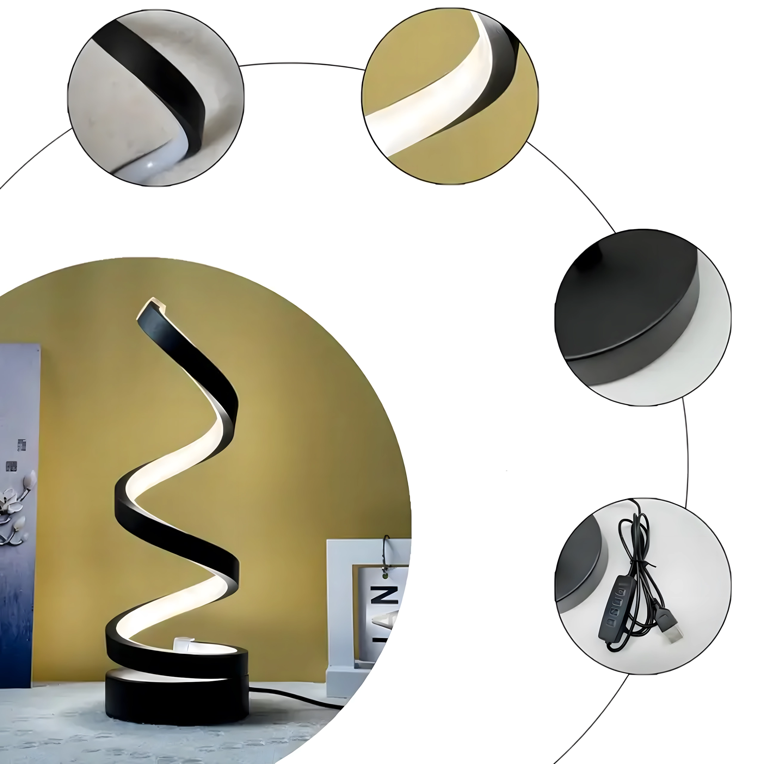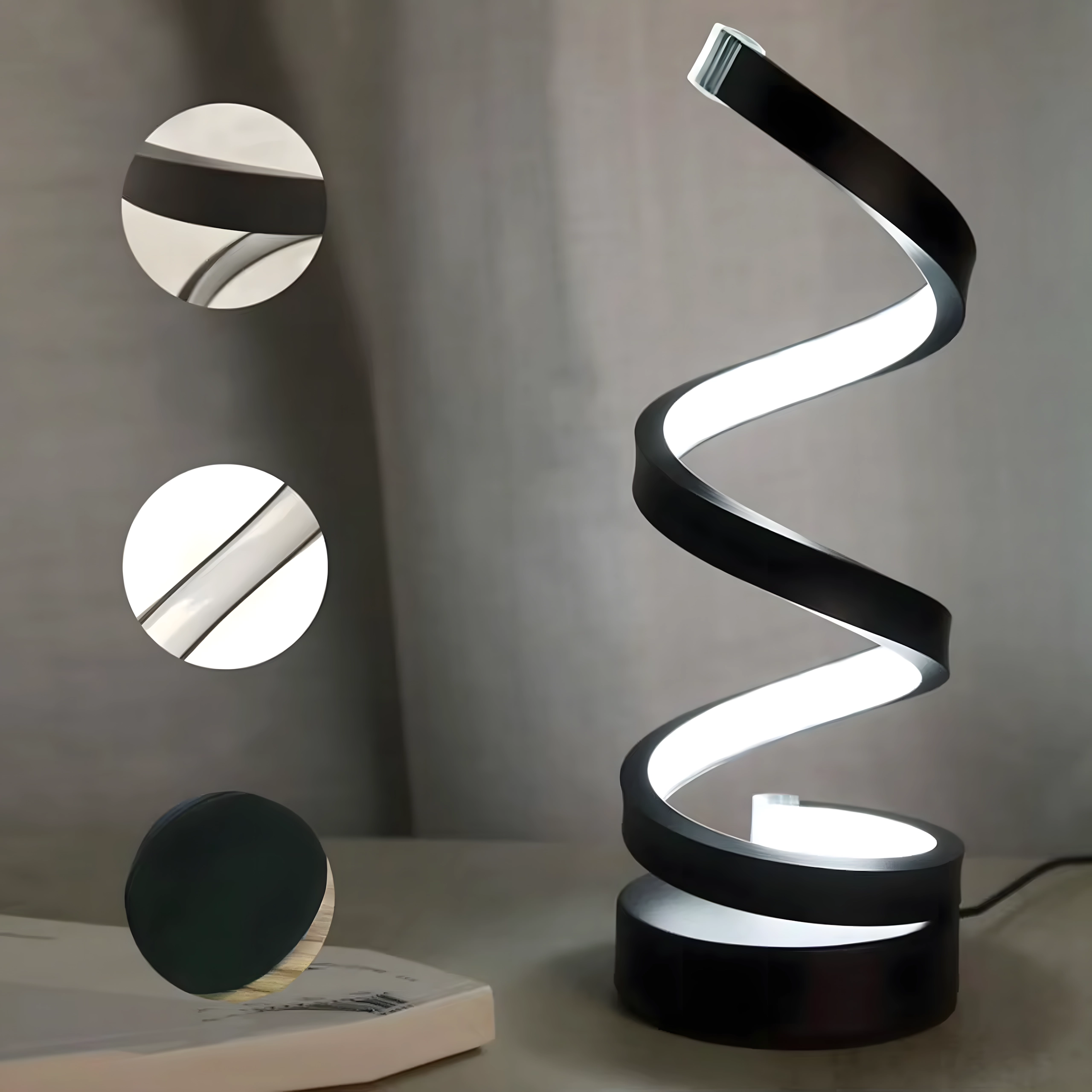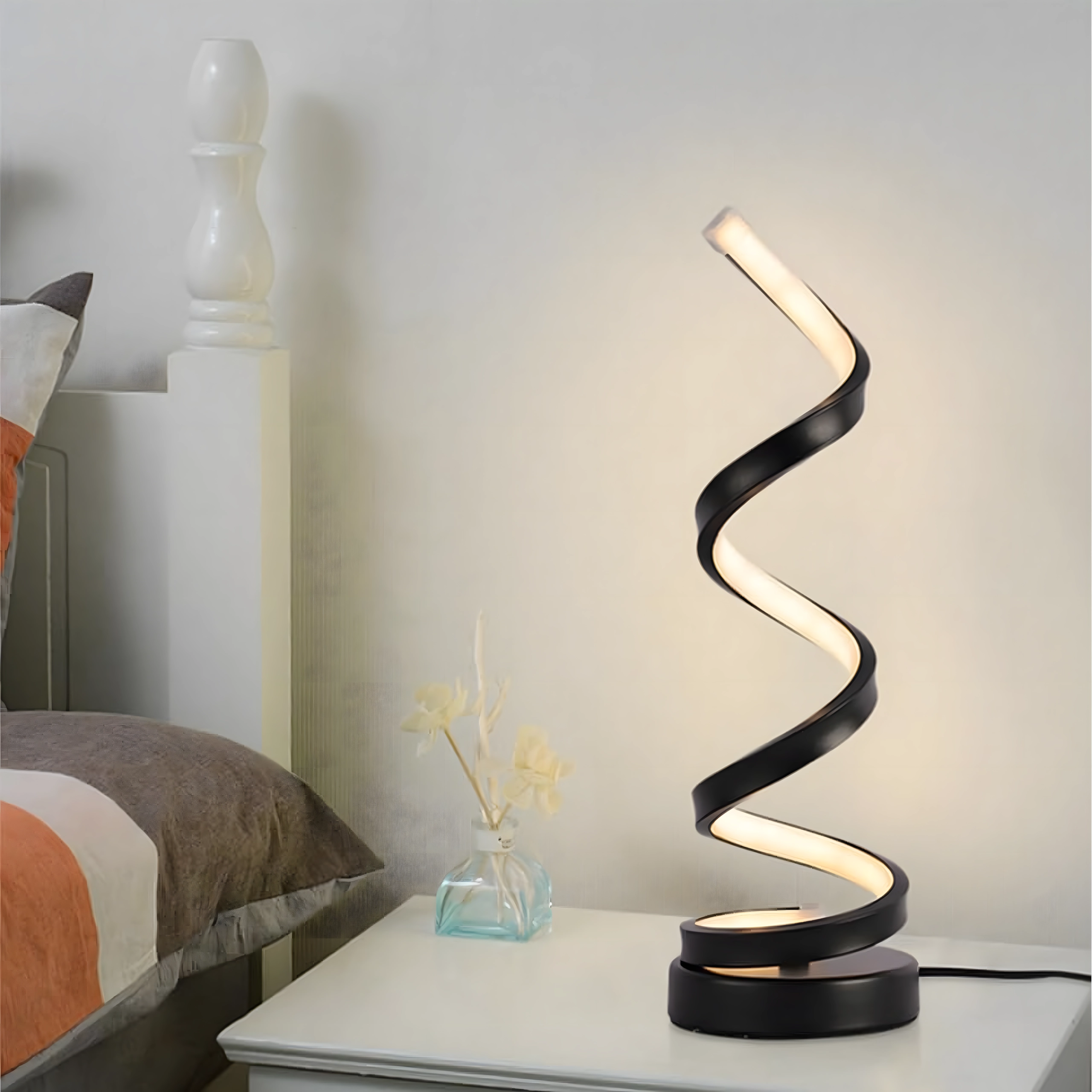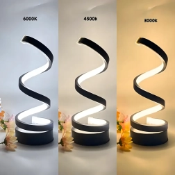 Spirala sculpturală funcționează ca element decorativ și sursă practică de lumină. Lampa este alimentată de la rețea prin cablu, oferind astfel funcționare stabilă și fiabilă fără încărcare. Se potrivește interioarelor moderne, dormitoarelor, livingurilor și zonelor de lucru.