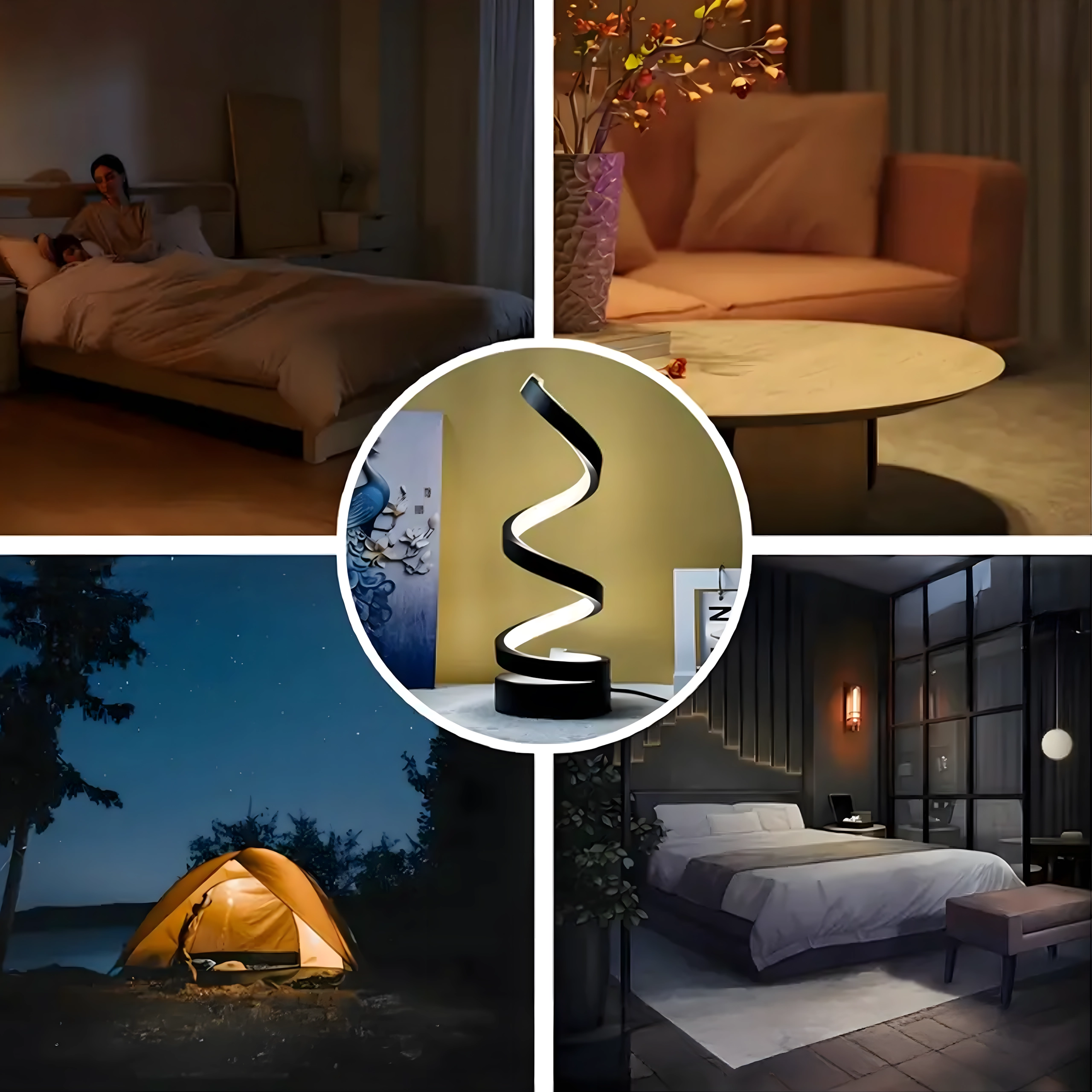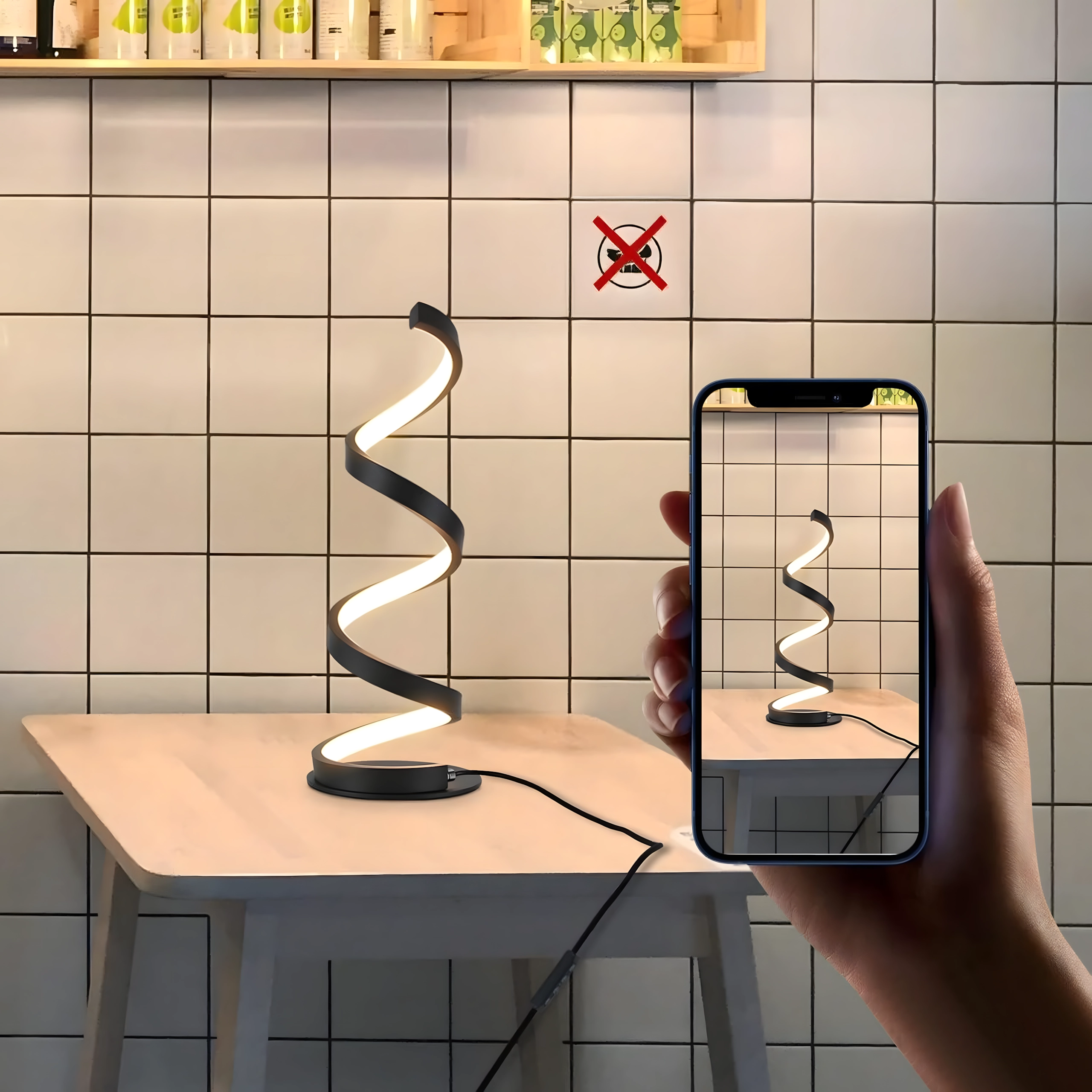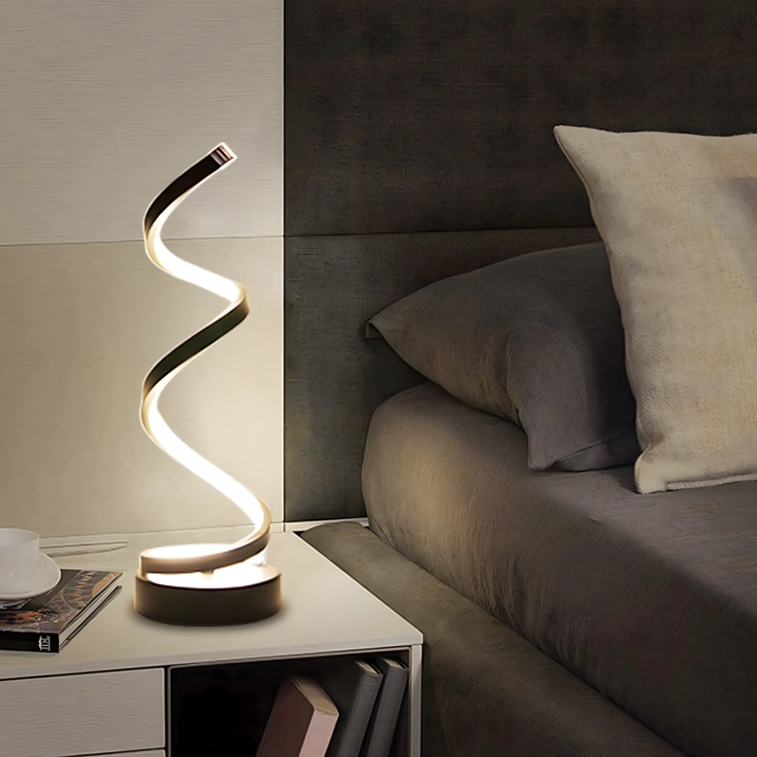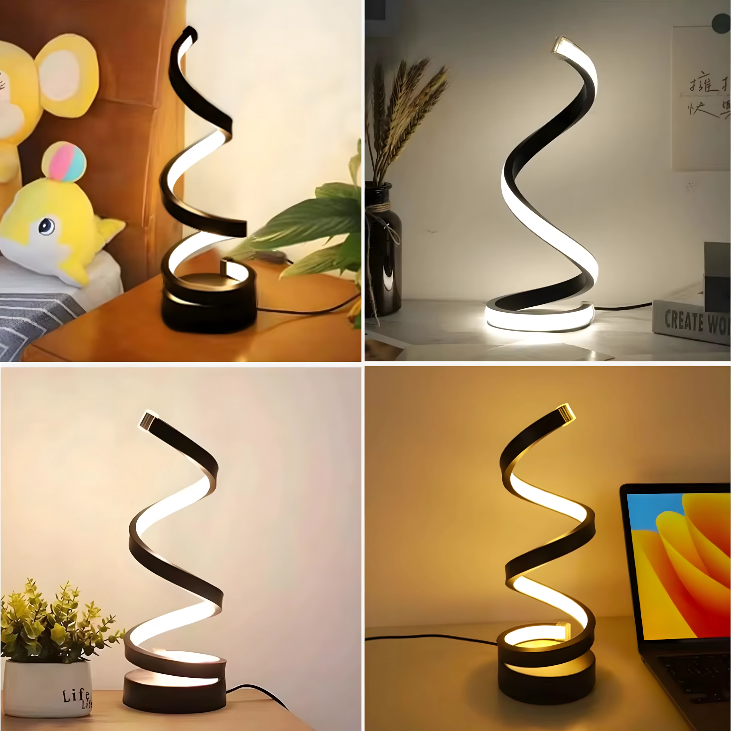 Spirala sculpturală funcționează ca element decorativ și sursă practică de lumină. Lampa este alimentată de la rețea prin cablu, oferind astfel funcționare stabilă și fiabilă fără încărcare. Se potrivește interioarelor moderne, dormitoarelor, livingurilor și zonelor de lucru.