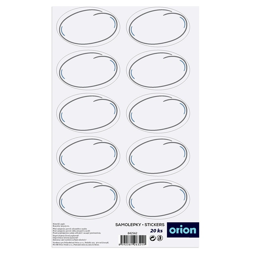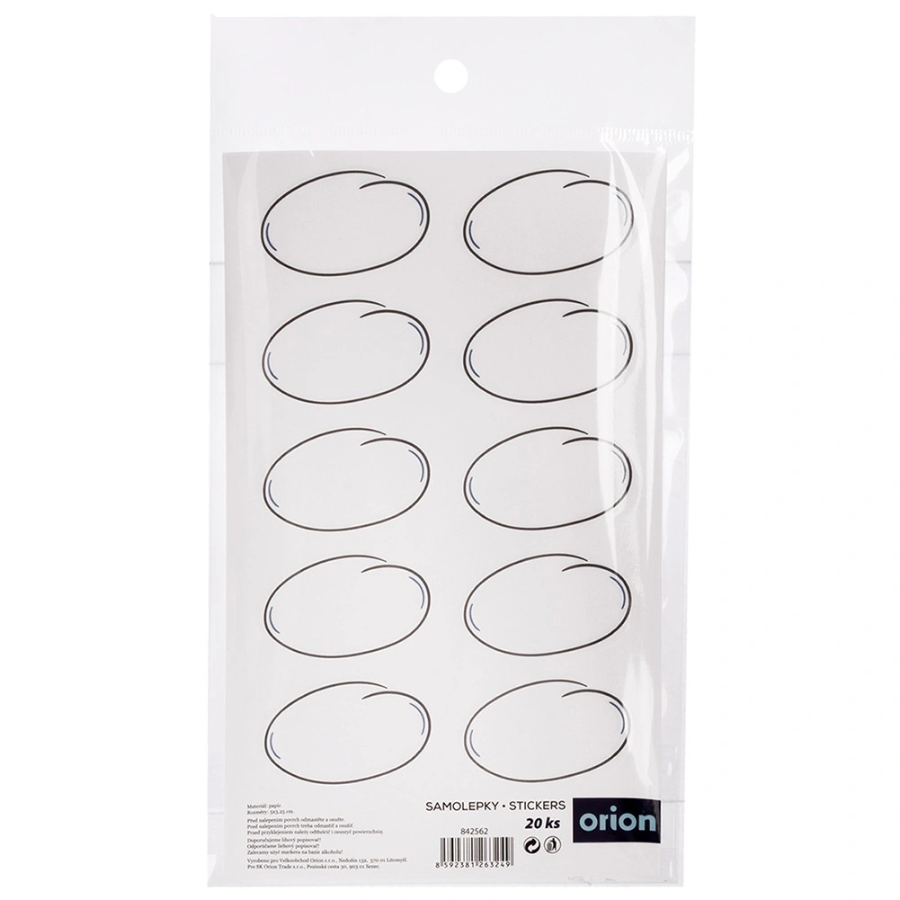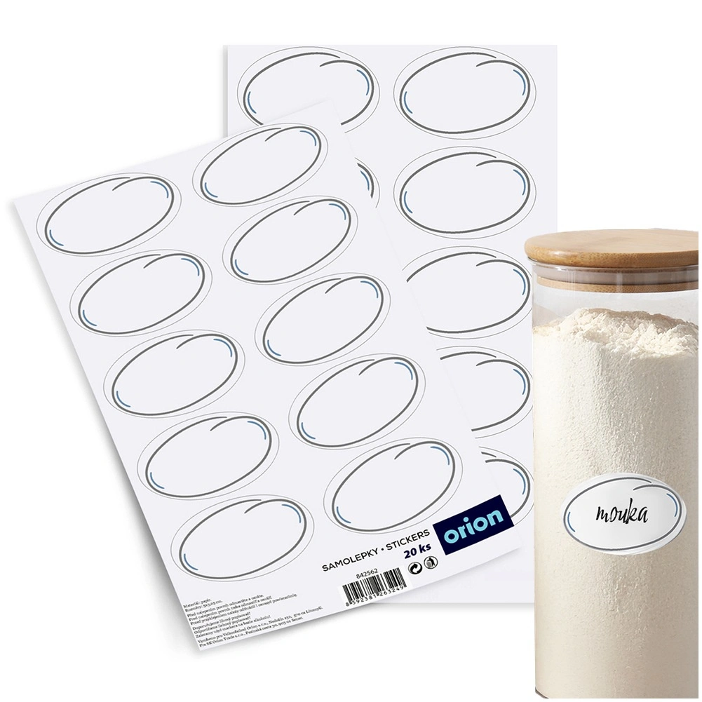 Set practic de 20 de etichete autoadezive cu dimensiunea de 5 × 3 cm, pentru marcarea clară a borcanelor, sticlelor și recipientelor. Etichetele albe, laminate, au un aspect curat și lizibil, se aplică ușor fără adeziv suplimentar și ajută la organizarea bucătăriei și a cămării. Produs original marca ORION, realizat conform standardelor europene.