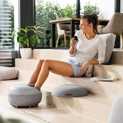 BEURER FM 120 combină confortul de acasă cu îngrijirea profesională a picioarelor. După îndepărtarea capacului, introduceți picioarele în camerele moi și, printr-o apăsare de buton, vă bucurați de un masaj shiatsu intens completat de masaj cu perne de aer. Presiunea delicată și frământarea stimulează punctele reflexogene, susțin circulația și eliberează tensiunea din zona tălpilor și călcâielor.