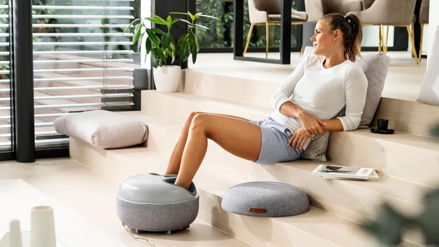 După montarea capacului, aparatul de masaj se transformă într-un suport elegant pentru picioare. Țesătura de calitate și forma compactă se potrivesc perfect în orice interior modern.
