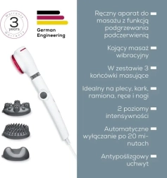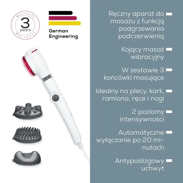 Datorită suprafeței mari de masaj și încălzire și capului rotativ pe un unghi de 180°, ajungi cu ușurință și în zonele mai greu accesibile. Trei capete de masaj de calitate permit adaptarea masajului la nevoile tale – de la masaj pe suprafață mare la masaj punctual.