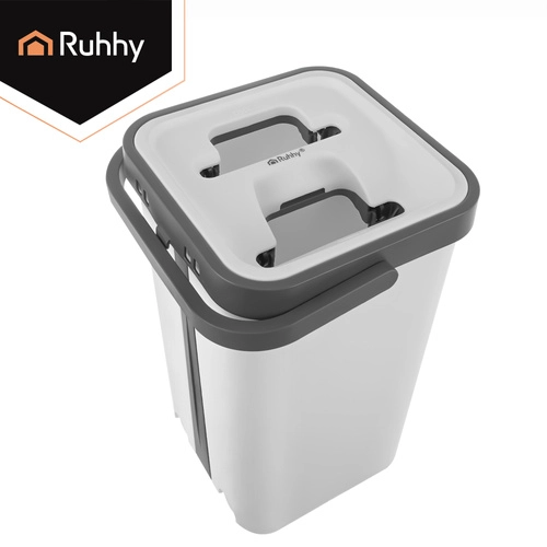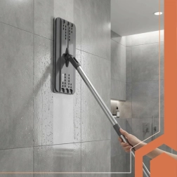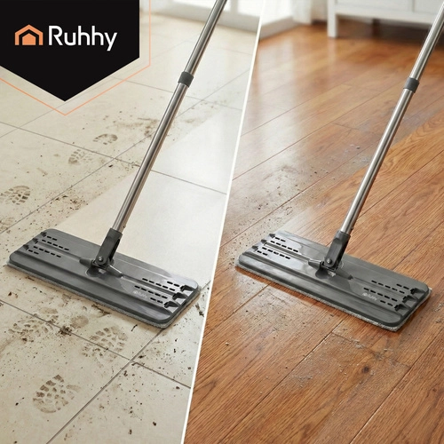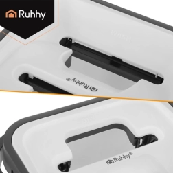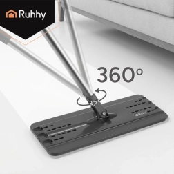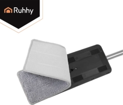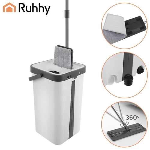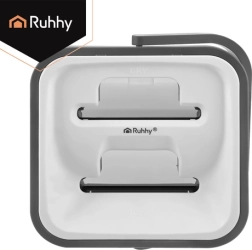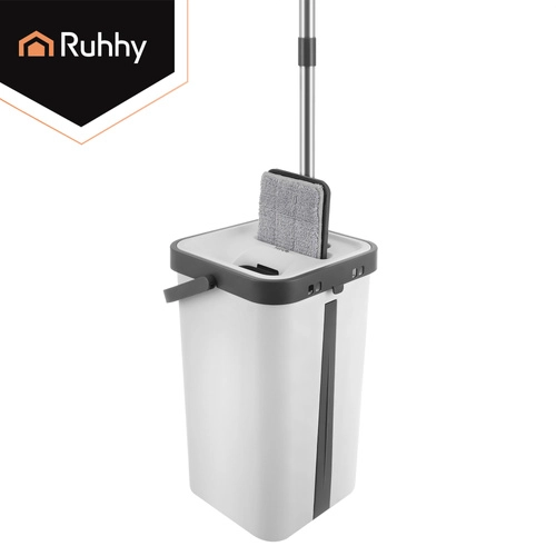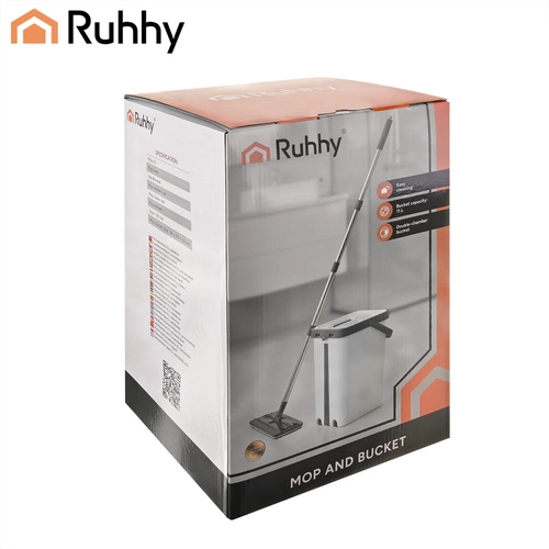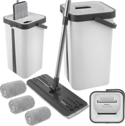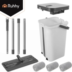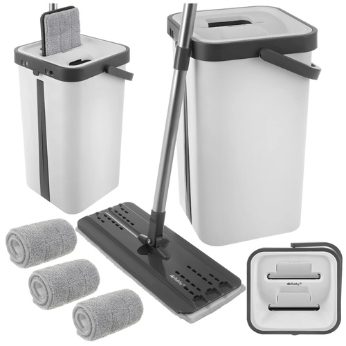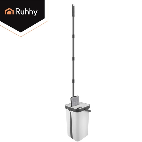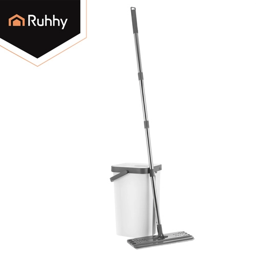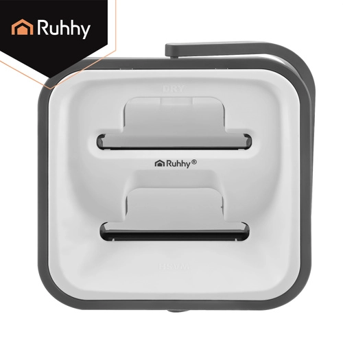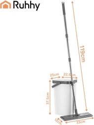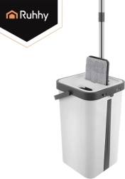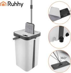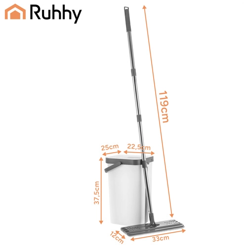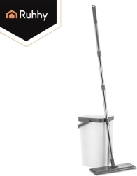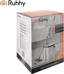 Mopul plat practic RUHHY cu găleată cu două camere de 11 l îți asigură spălare igienică întotdeauna cu apă curată. Datorită stoarcerii fără atingere, mâinile rămân uscate, iar podeaua fără dâre. Capul rotativ la 360° ajunge sub mobilier și în colțuri, iar 3 huse care se usucă rapid permit curățenie neîntreruptă.