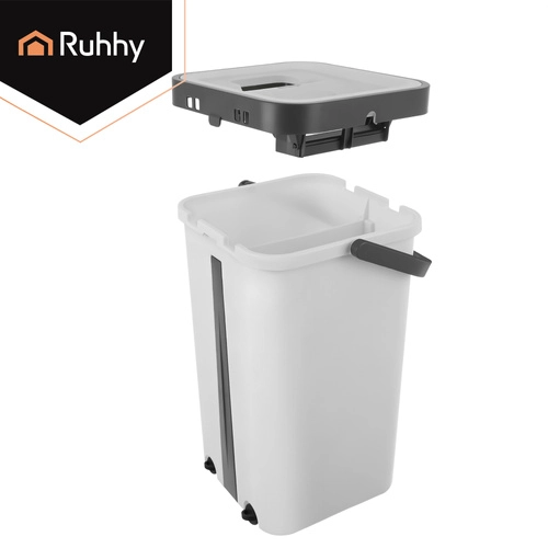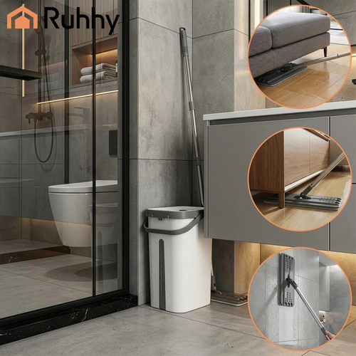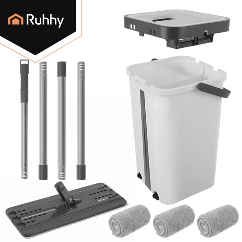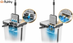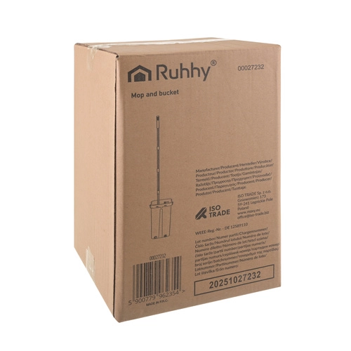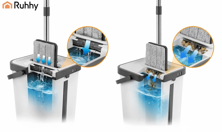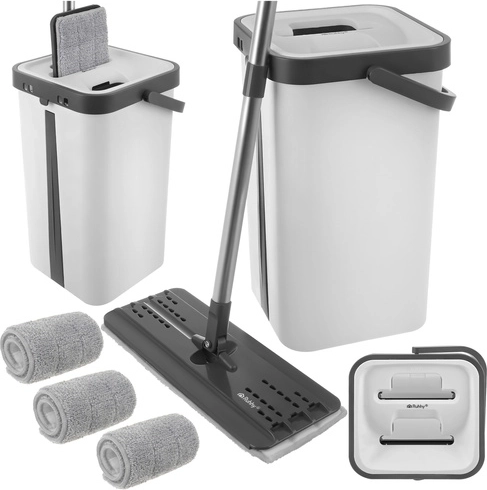 Setul RUHHY combină o găleată mare cu două camere pentru clătire și stoarcere separat, astfel încât murdăria nu se întoarce pe podea. Sistemul fără atingere reglează umiditatea mopului fără picurare și este delicat cu podelele sensibile.