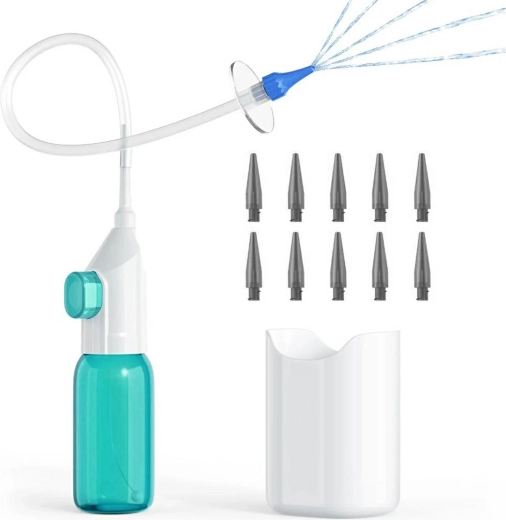 Setul include tot ce aveți nevoie pentru o utilizare igienică – duze de unică folosință pentru utilizatori diferiți și un recipient practic pentru colectarea apei folosite. Datorită dimensiunilor compacte, irigatorul este ideal pentru utilizare acasă și în călătorii.