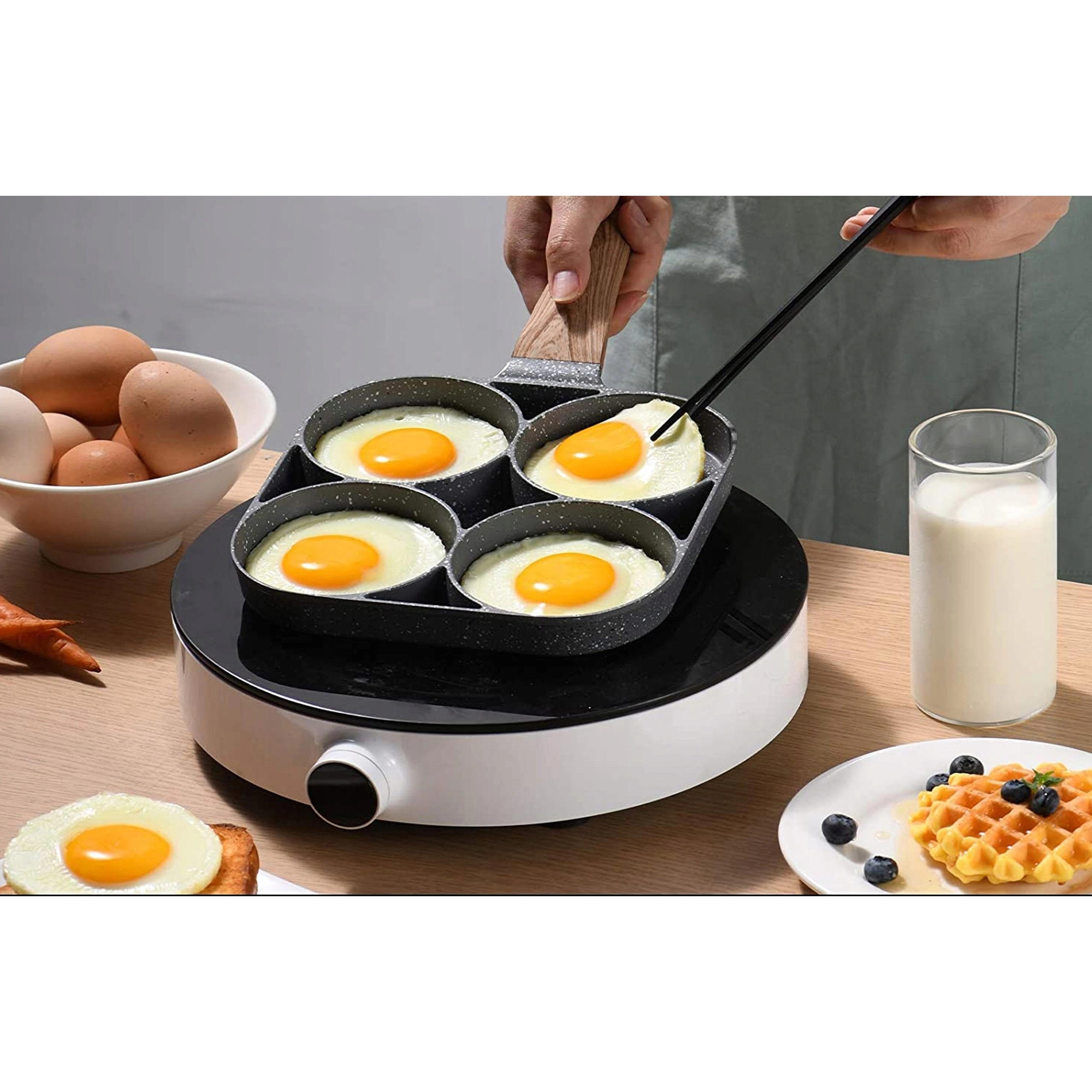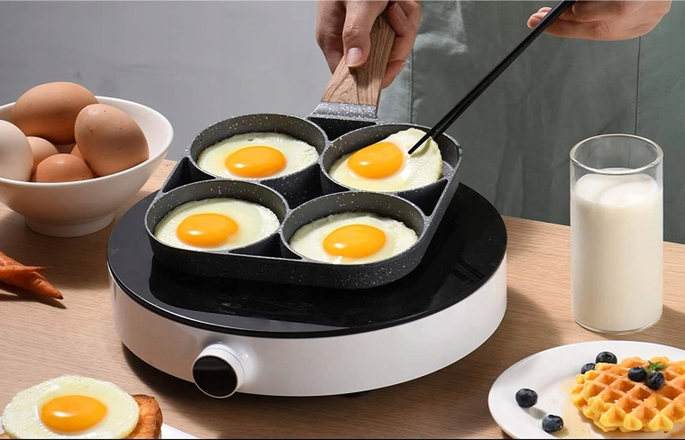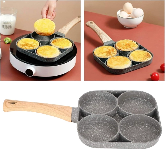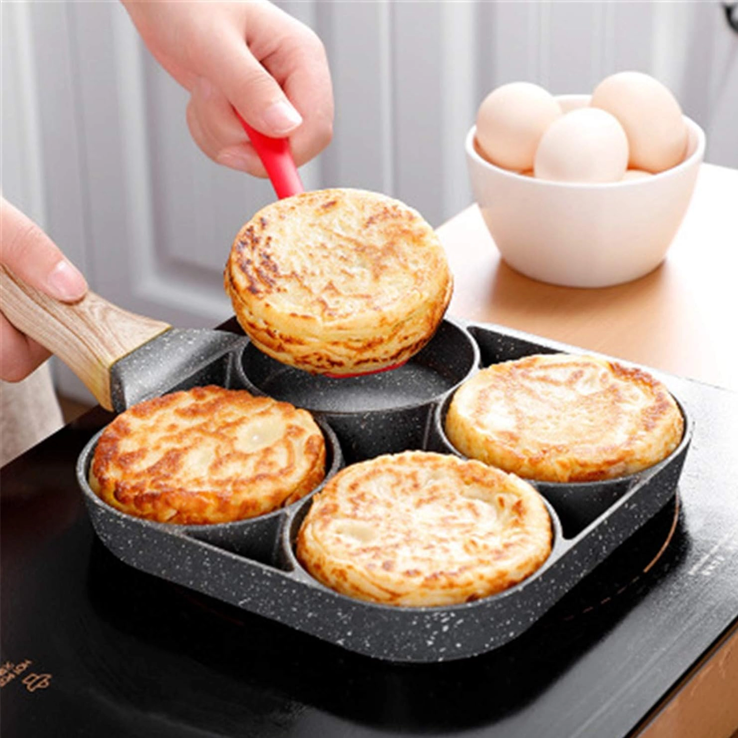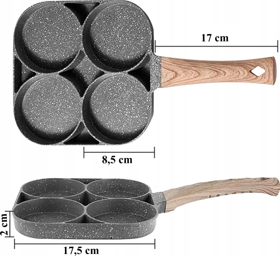 Această tigaie cu patru compartimente este ideală pentru pregătirea rapidă și echilibrată a micului dejun sau a gustărilor. Camerele separate păstrează porțiile frumos rotunde și uniforme, iar stratul antiaderent punctat permite întoarcerea ușoară fără lipire și o curățare simplă.