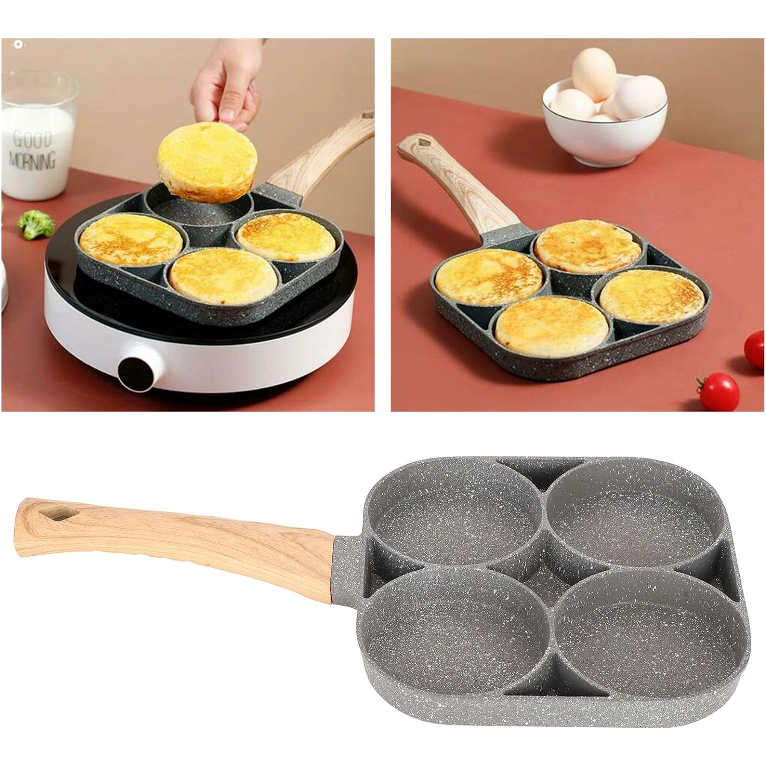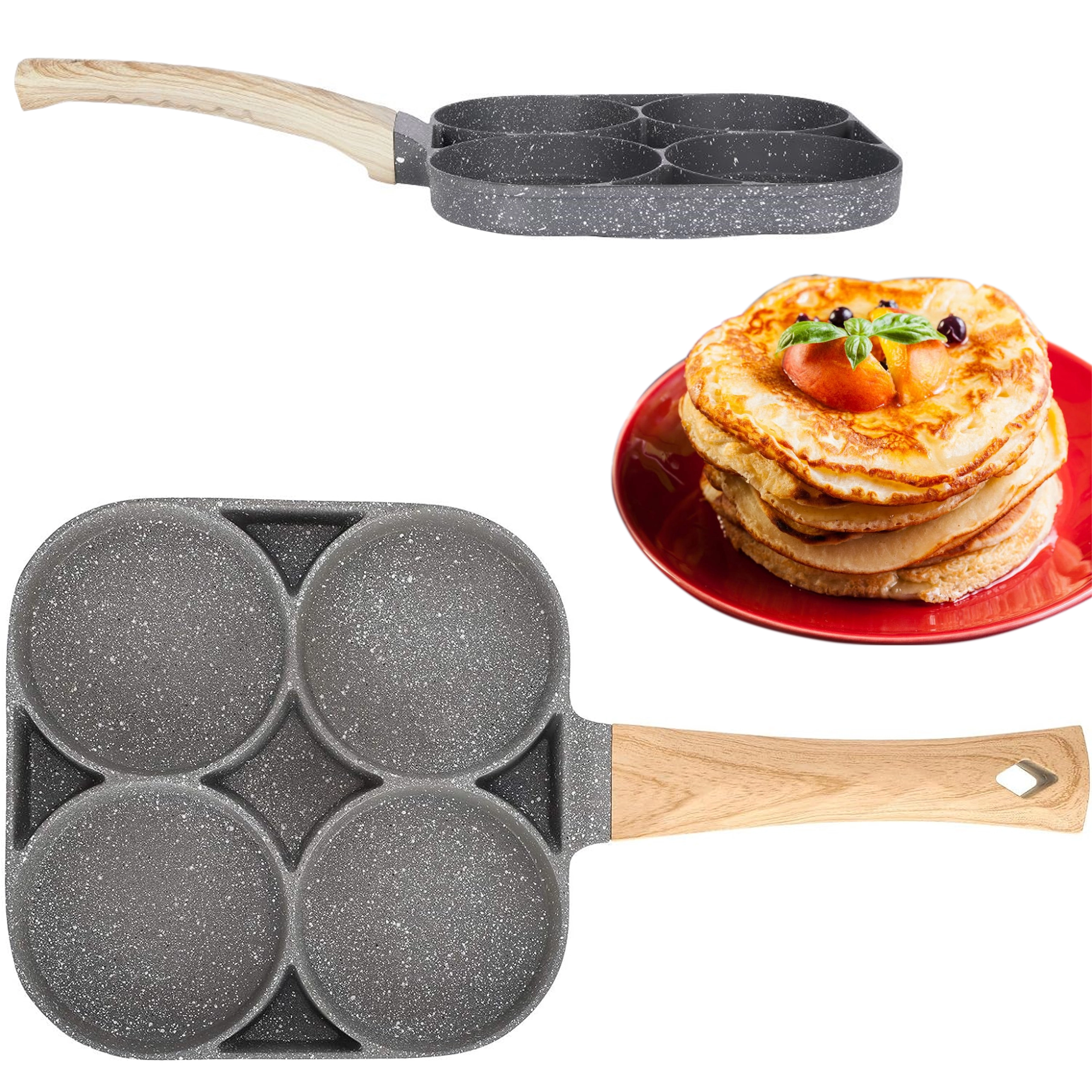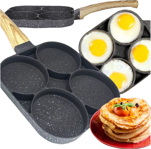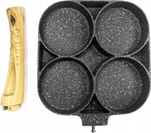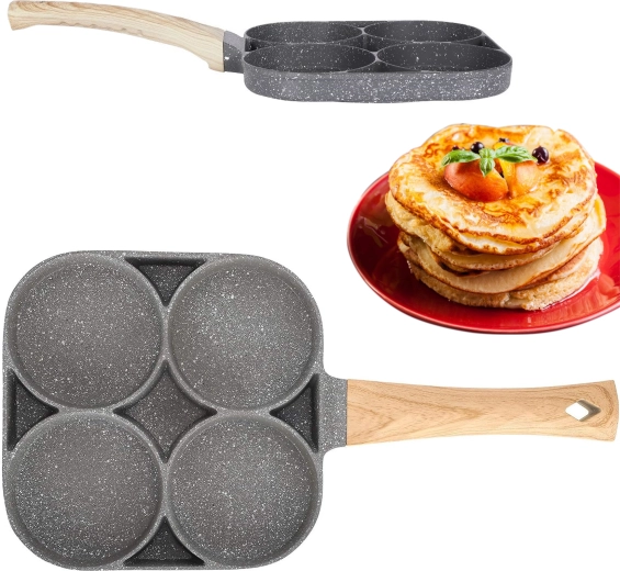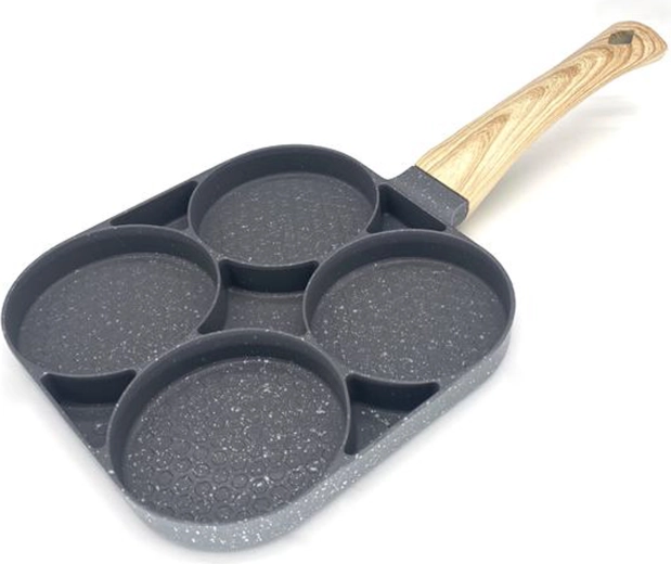 Pregătește micul dejun mai rapid și fără dezordine cu această tigaie versatilă cu patru camere rotunde. Datorită stratului antiaderent și distribuției uniforme a căldurii, vei găti ouă, clătite americane, turte și mini clătite perfect formate, simultan. Mânerul ergonomic cu aspect de lemn este plăcut la priză, iar tigaia este potrivită pentru inducție, gaz și alte tipuri de plite.