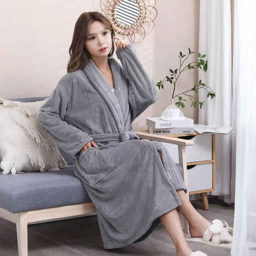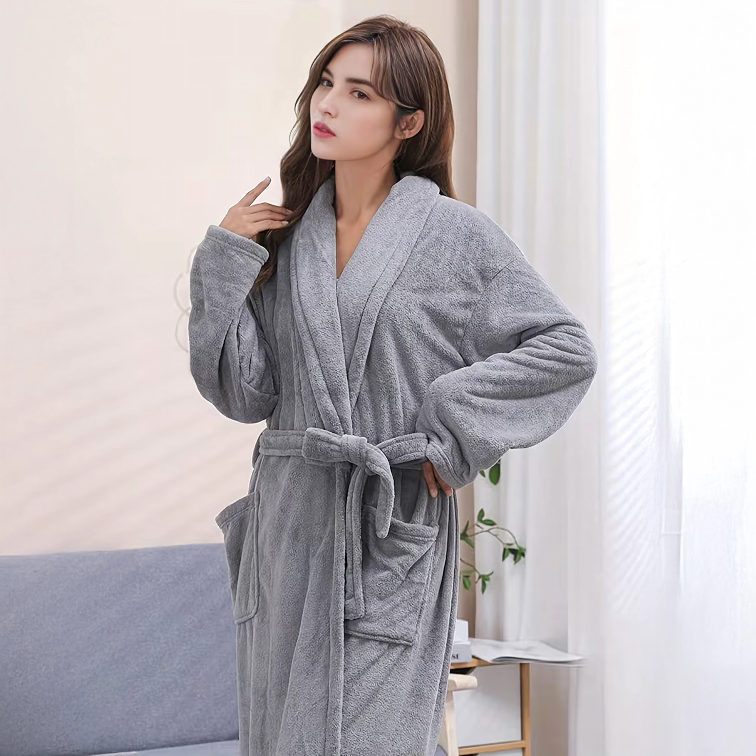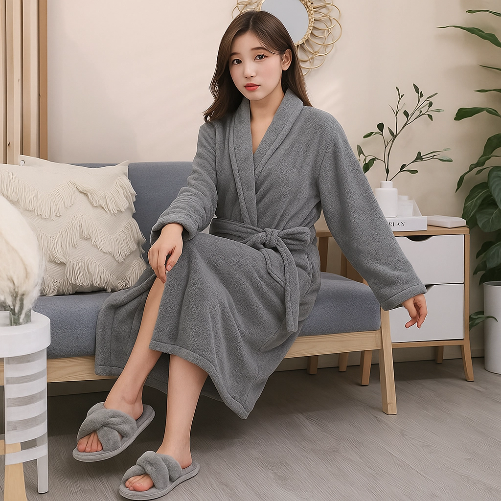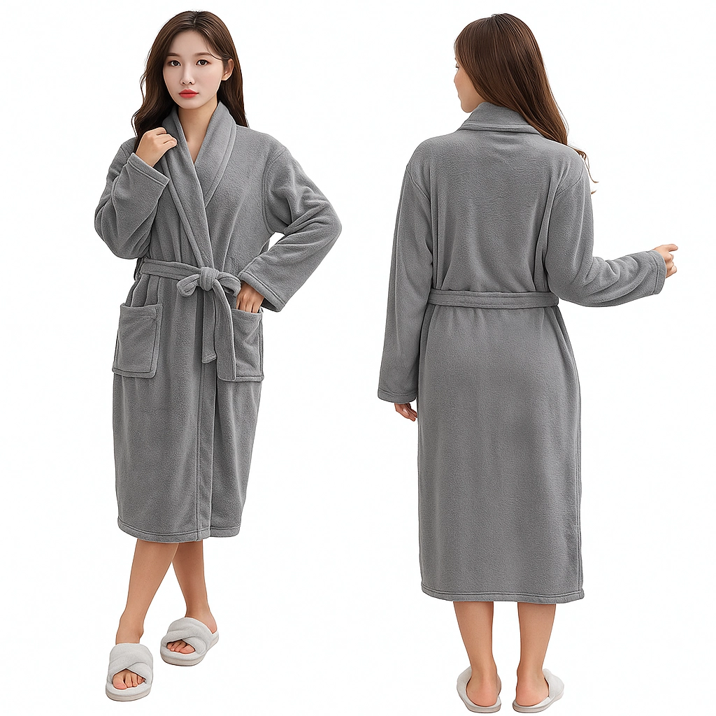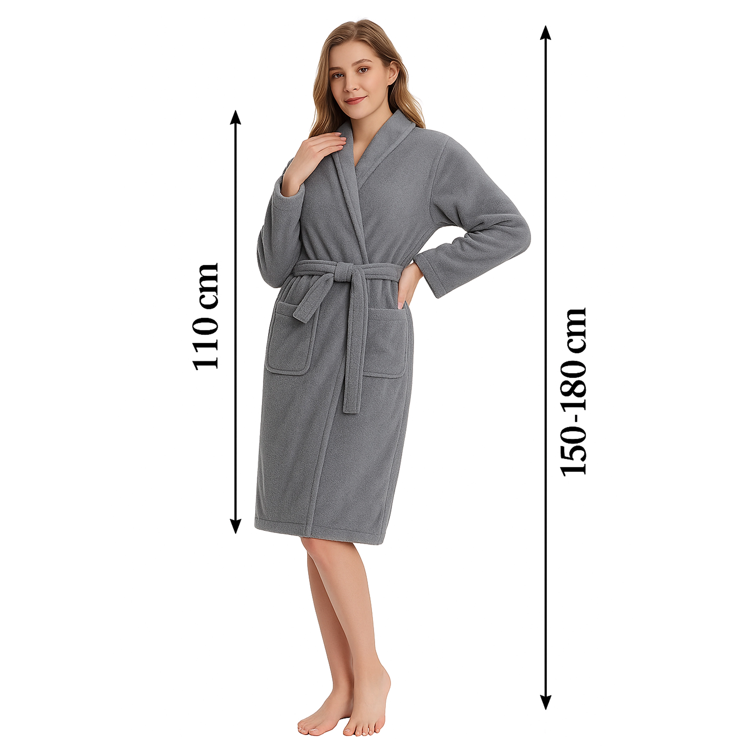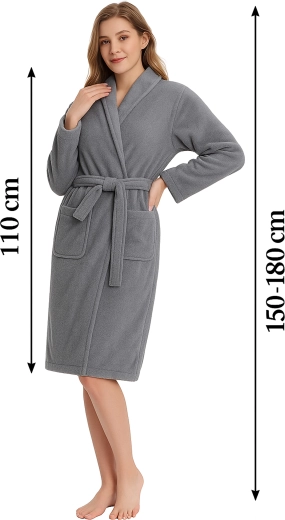 Acest halat de damă, în nuanță elegantă de gri, este ideal pentru momentele de relaxare acasă și după duș. Microfibra plușată, fină la atingere, vă încălzește plăcut, iar gulerul tip șal și cordonul în talie evidențiază croiala comodă și ajustarea ușoară pe siluetă.
