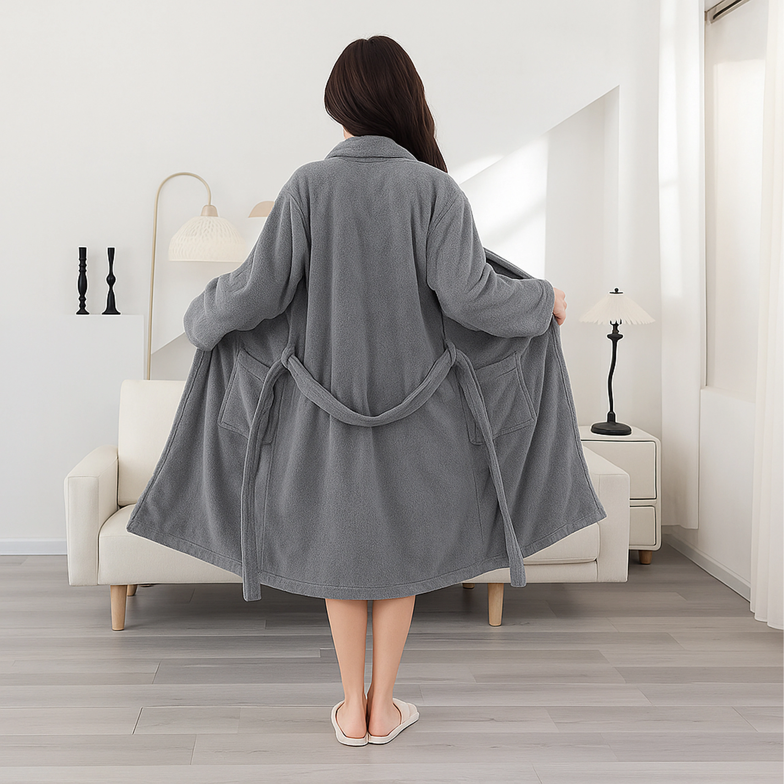 Materialul plușat oferă căldură imediată și confort catifelat după baie sau în momentele de răsfăț.