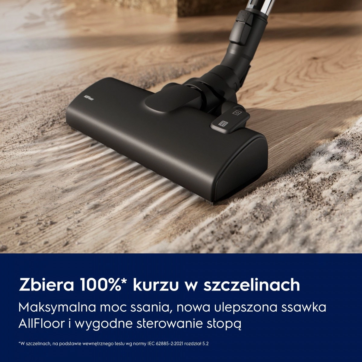 Aspiratorul atinge o eficiență ridicată de colectare a prafului din rosturi, iar cu noua duză AllFloor face față atât pardoselilor dure, cât și covoarelor. Comutarea periei se face comod cu piciorul.