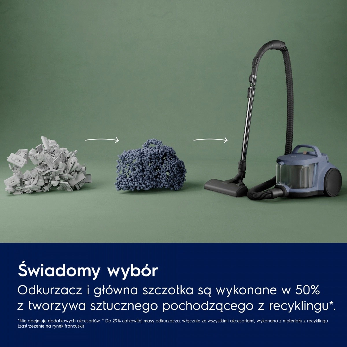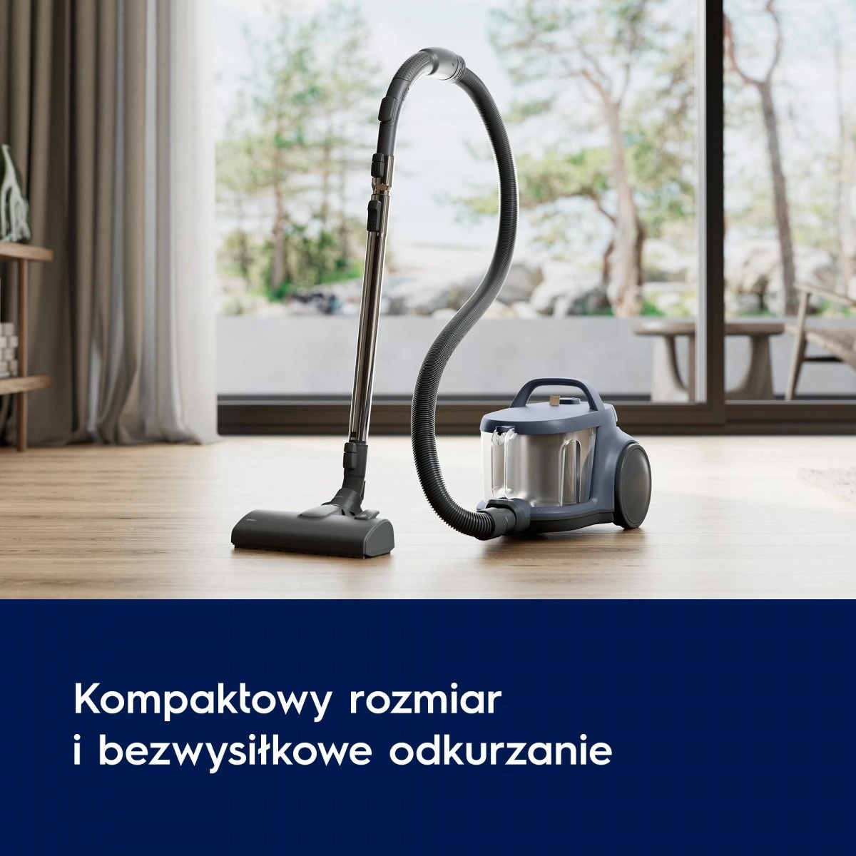 Carcasa compactă, roțile mari și raza de acțiune de 9 m facilitează manevrarea și depozitarea. Sistemul de filtrare HEPA reține până la 99,95% din particulele de 0,3 μm, astfel încât aerul din locuință va fi mai curat.