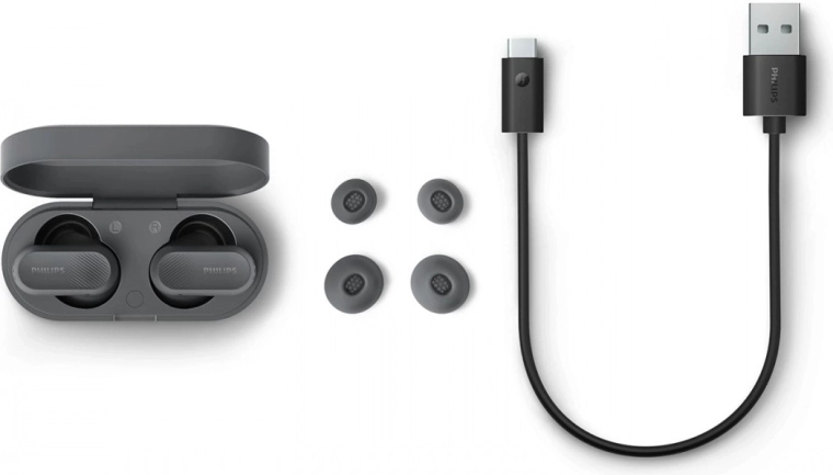 - căști, carcasă de încărcare, dopuri de schimb (mărimi diferite), cablu USB‑A la USB‑C