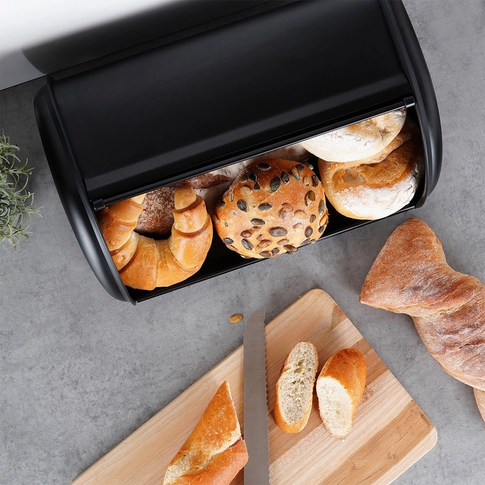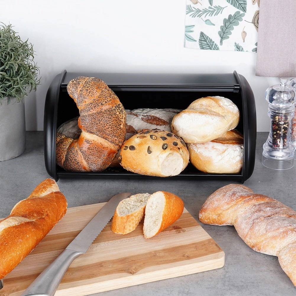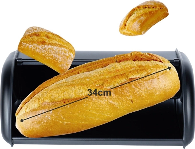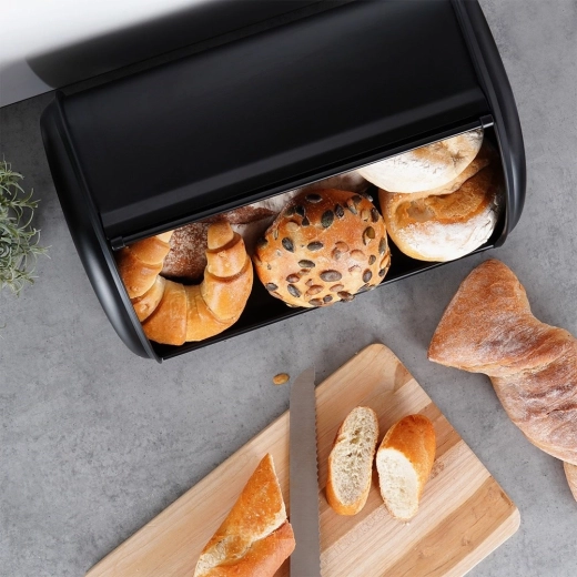 Utilizare zilnică ușoară datorită deschiderii line cu partea frontală rulantă, care economisește spațiu pe blat. Corpul metalic este stabil și rezistent la deteriorări, astfel încât produsele de panificație rămân în siguranță. Cutia de pâine este și o soluție practică pentru organizarea blatului – reduce dezordinea și protejează produsele de panificație de contactul cu aerul.