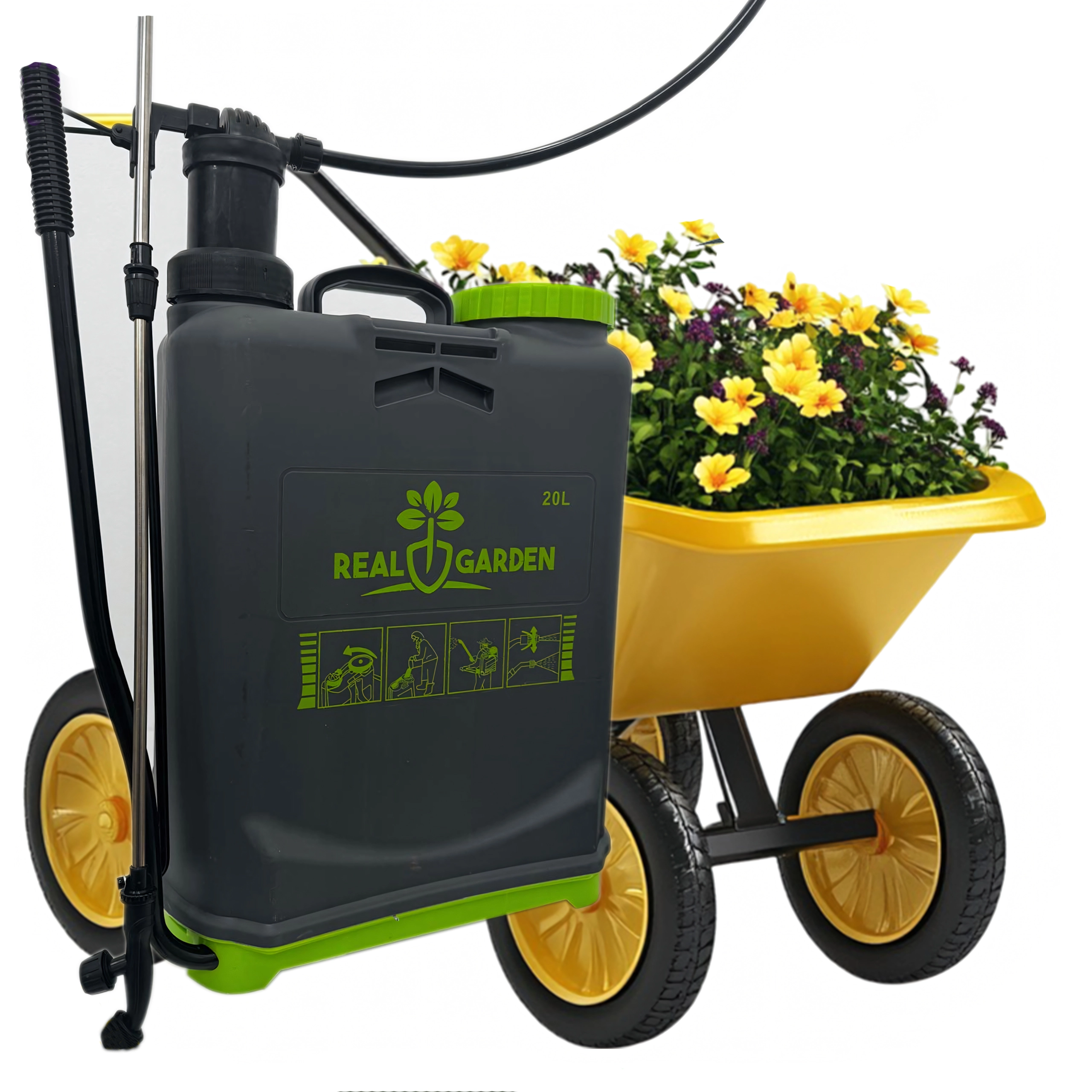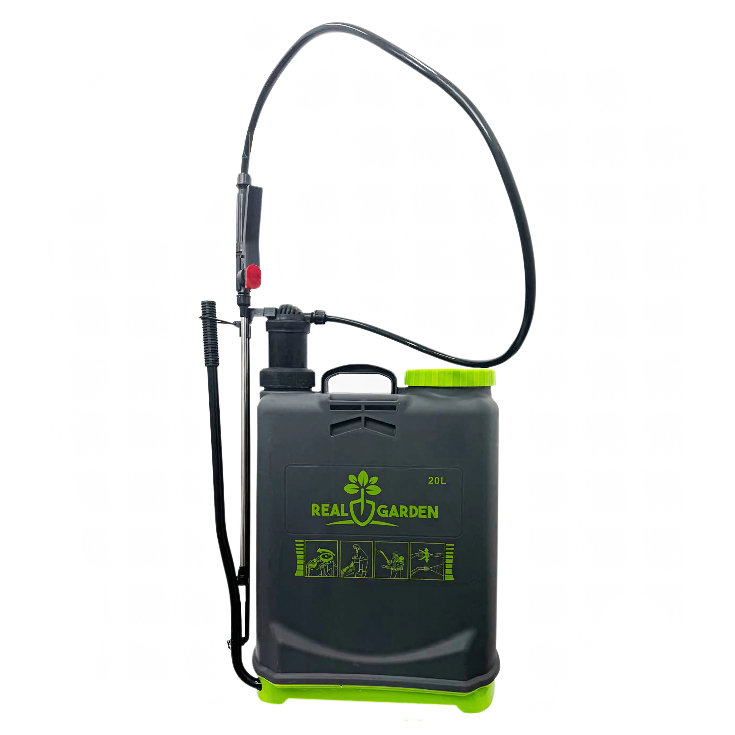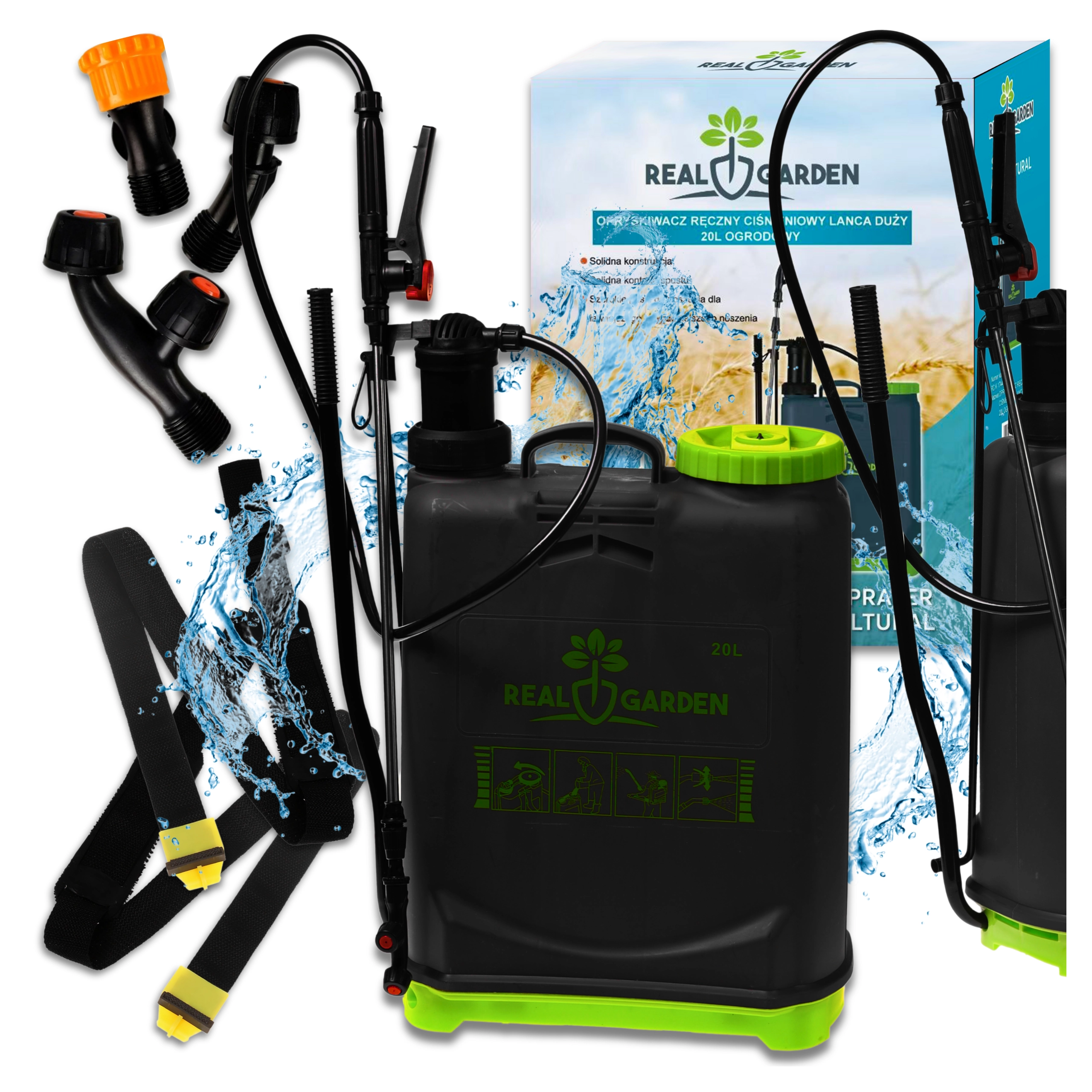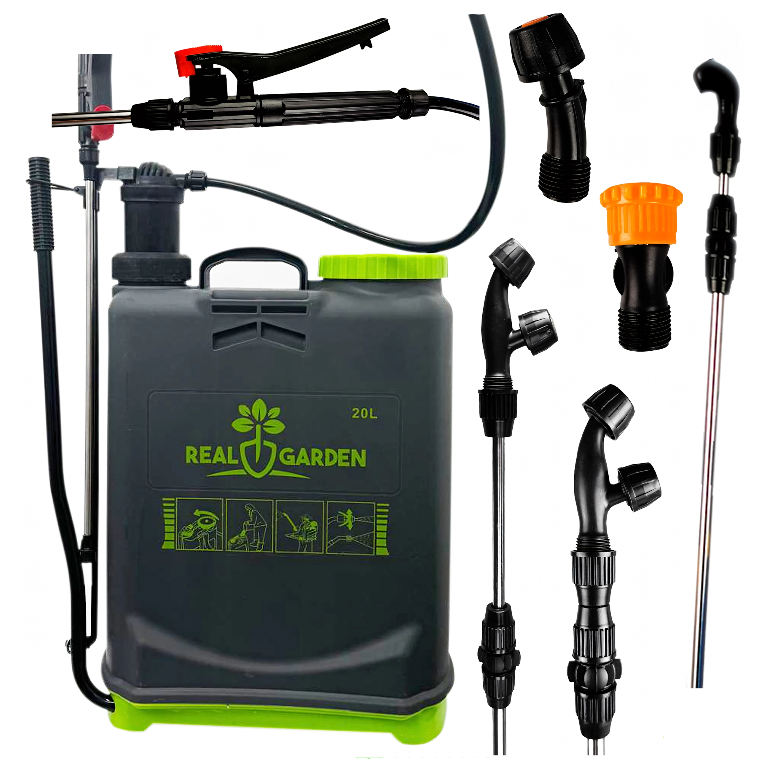 Sunt incluse mai multe duze interschimbabile pentru diferite tipuri de pulverizare – de la ceață fină la jet continuu. Bretelele confortabile distribuie sarcina pe spate, iar baza stabilă oferă siguranță la așezare. Ideal pentru sere, straturi, livezi și peluze.