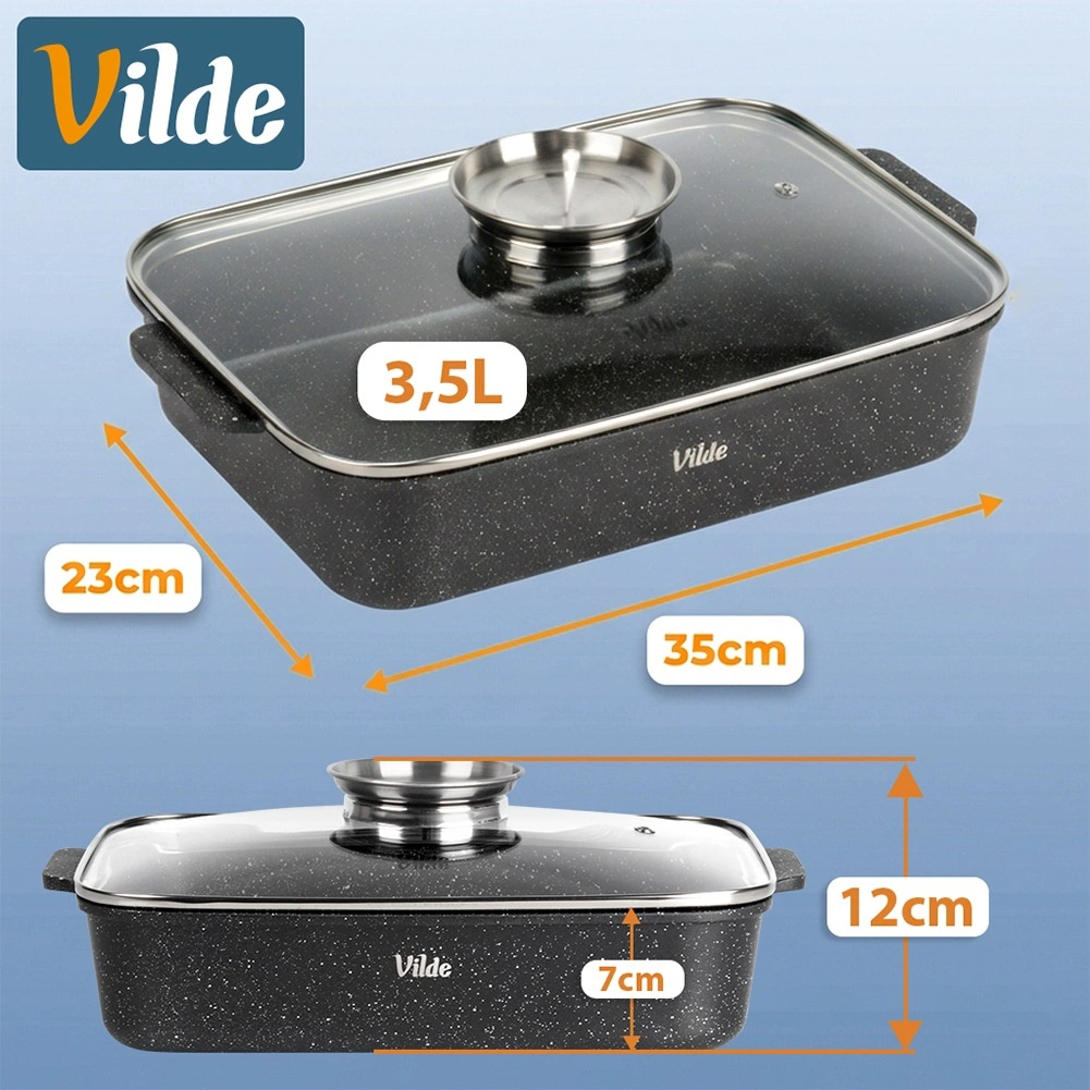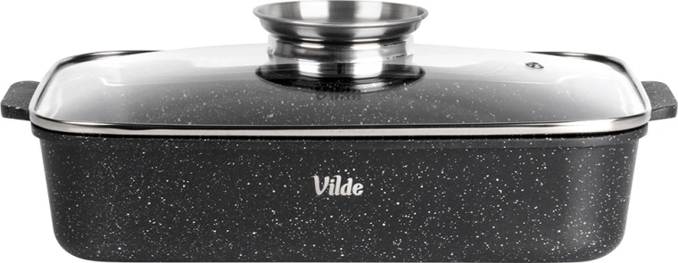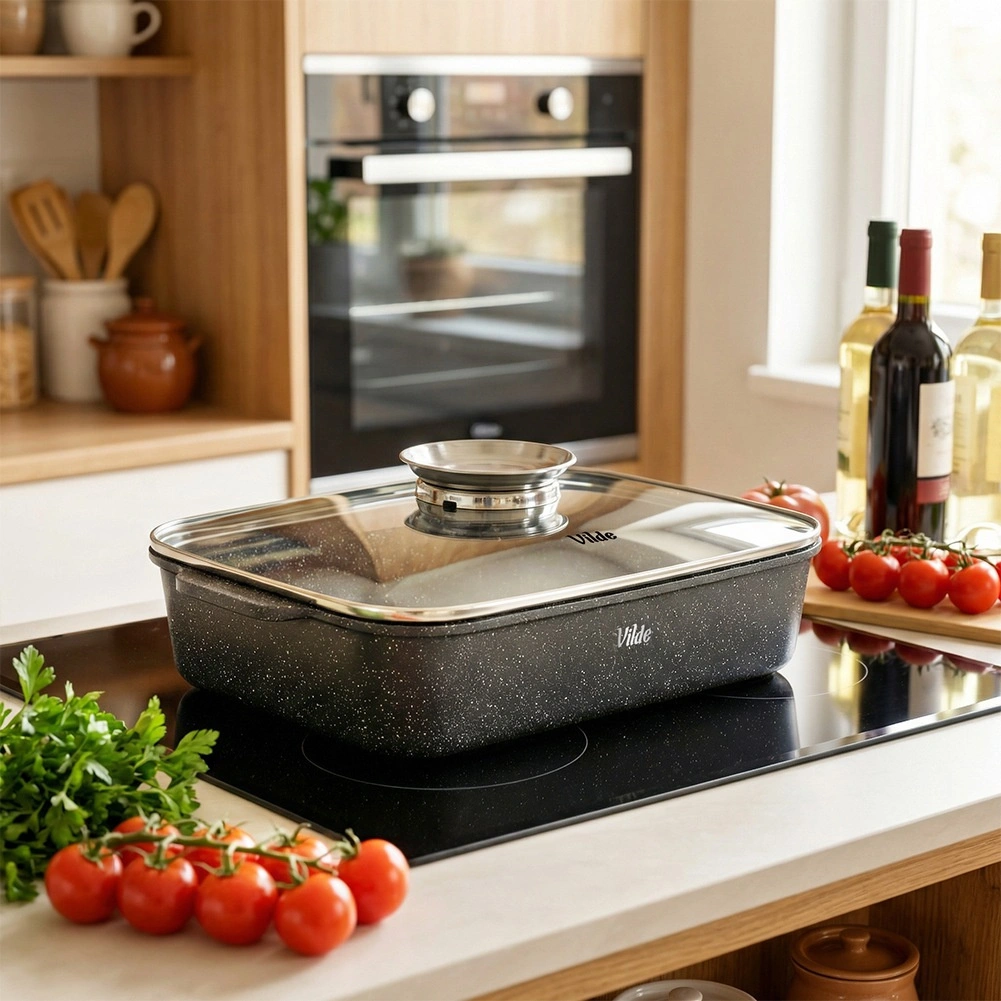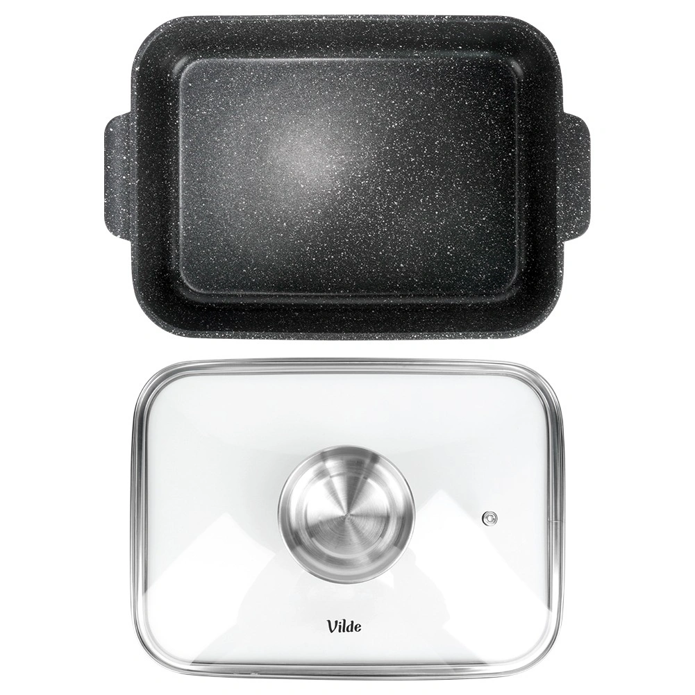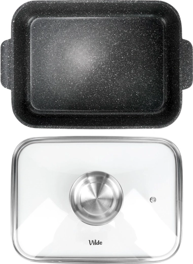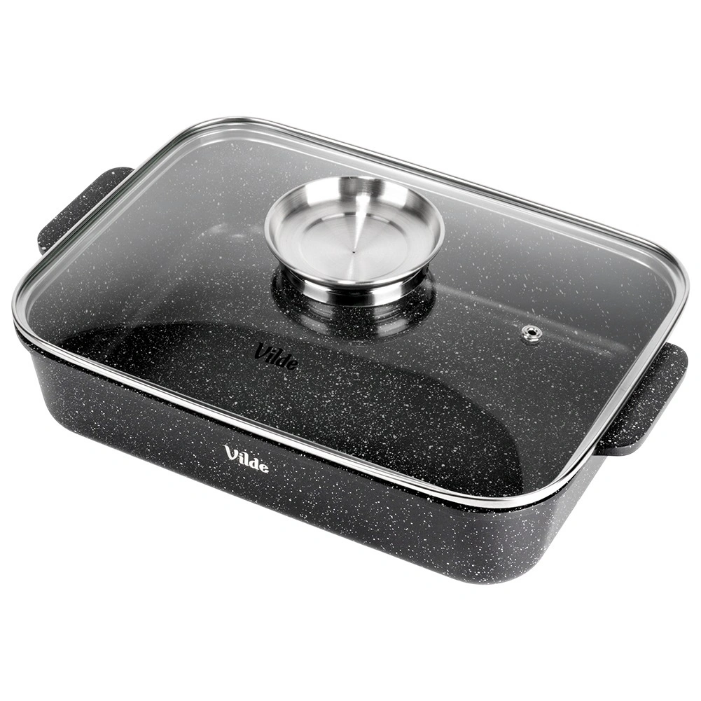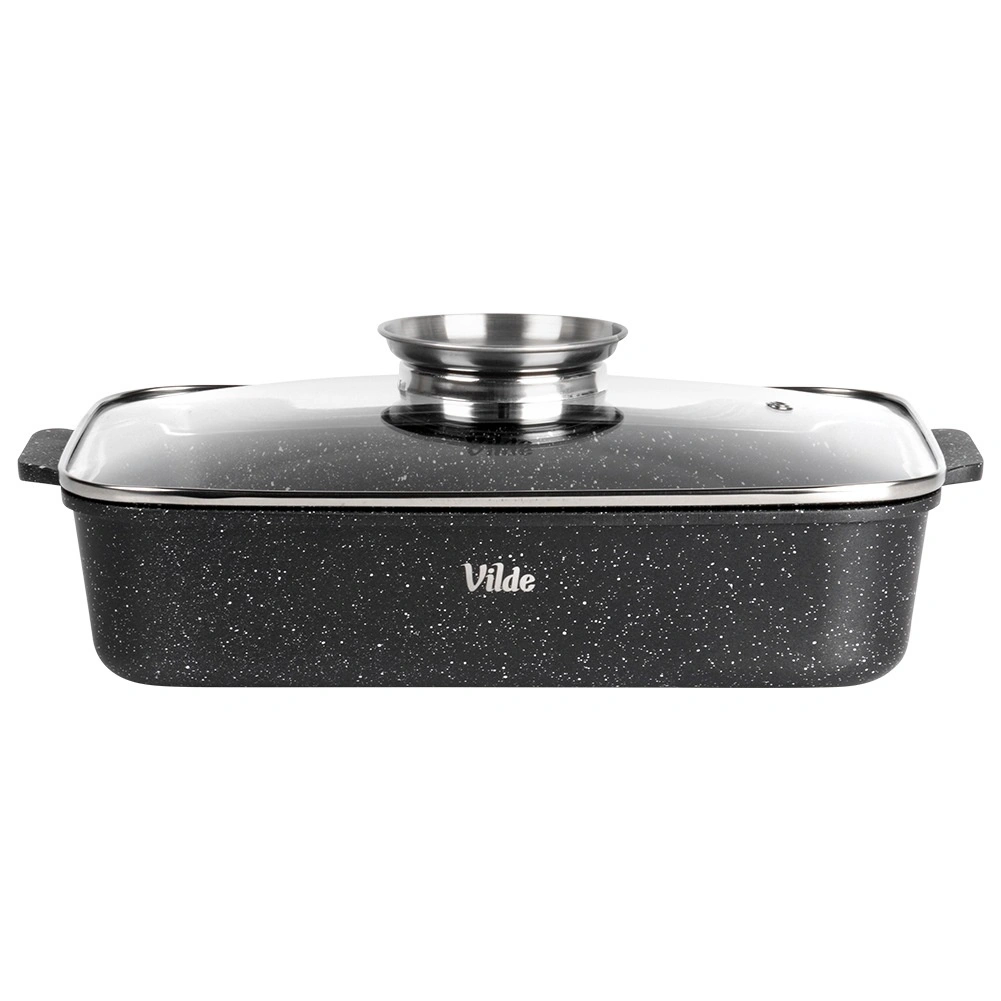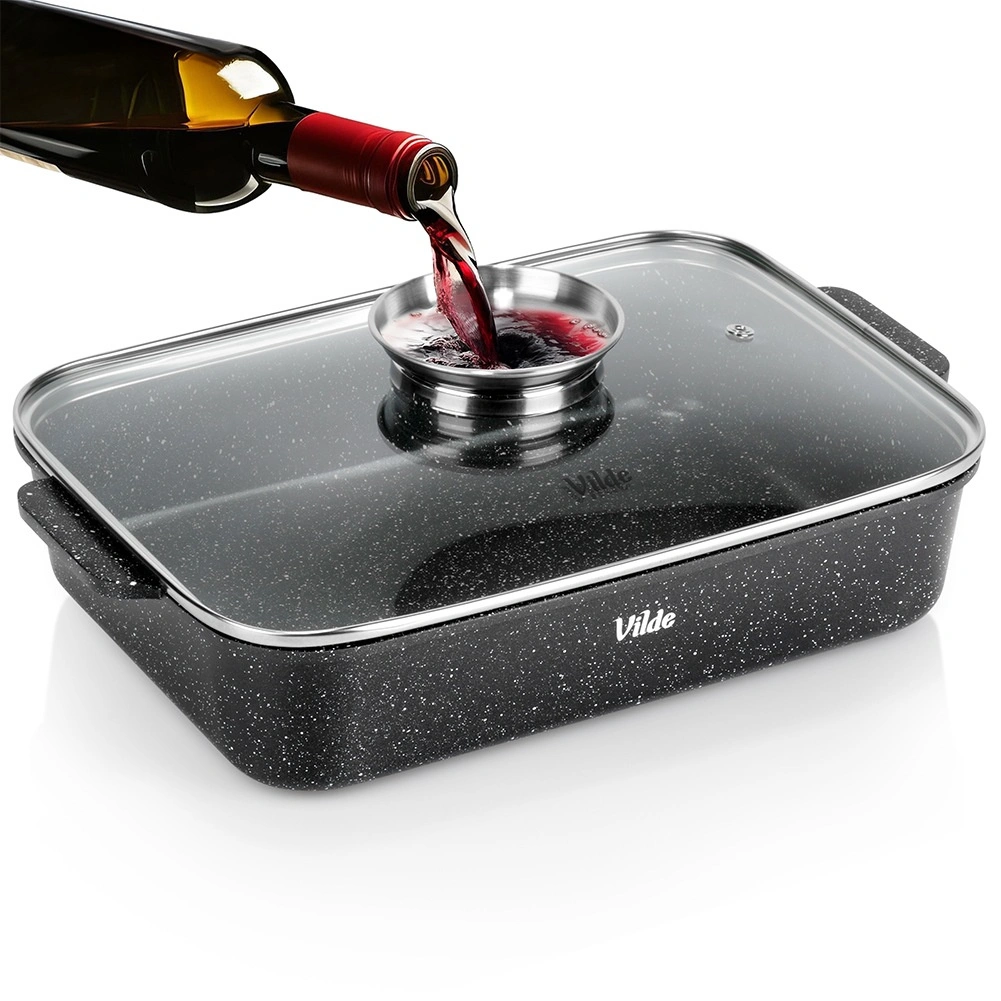 Tava dreptunghiulară din aluminiu turnat sub presiune, cu strat antiaderent din granit rezistent, distribuie uniform căldura și menține mâncarea caldă mai mult timp. Capacul din sticlă cu supapă de abur și dozator integrat pentru lichide aromatizante permite adăugarea de apă sau vin fără deschidere, astfel încât preparatul își păstrează suculența și aroma.
