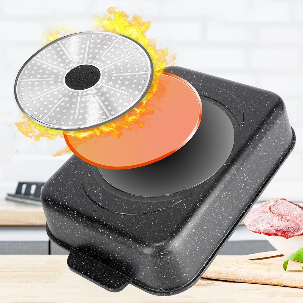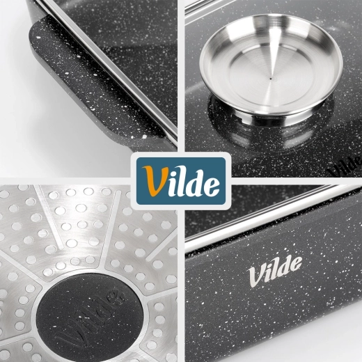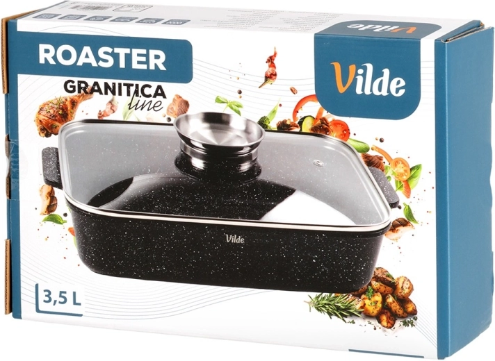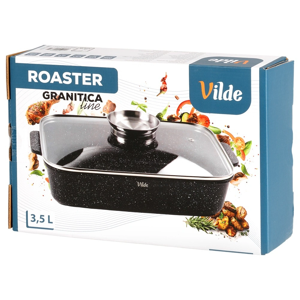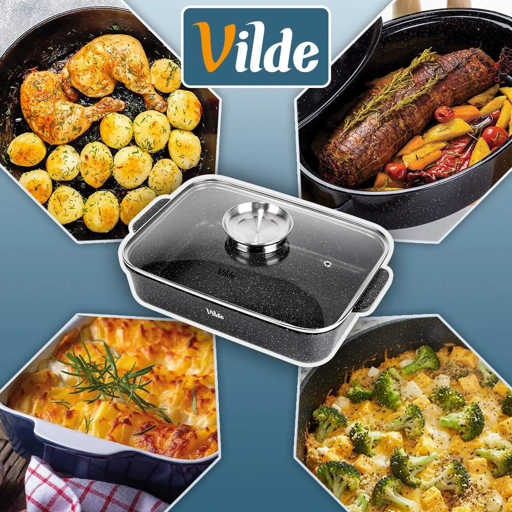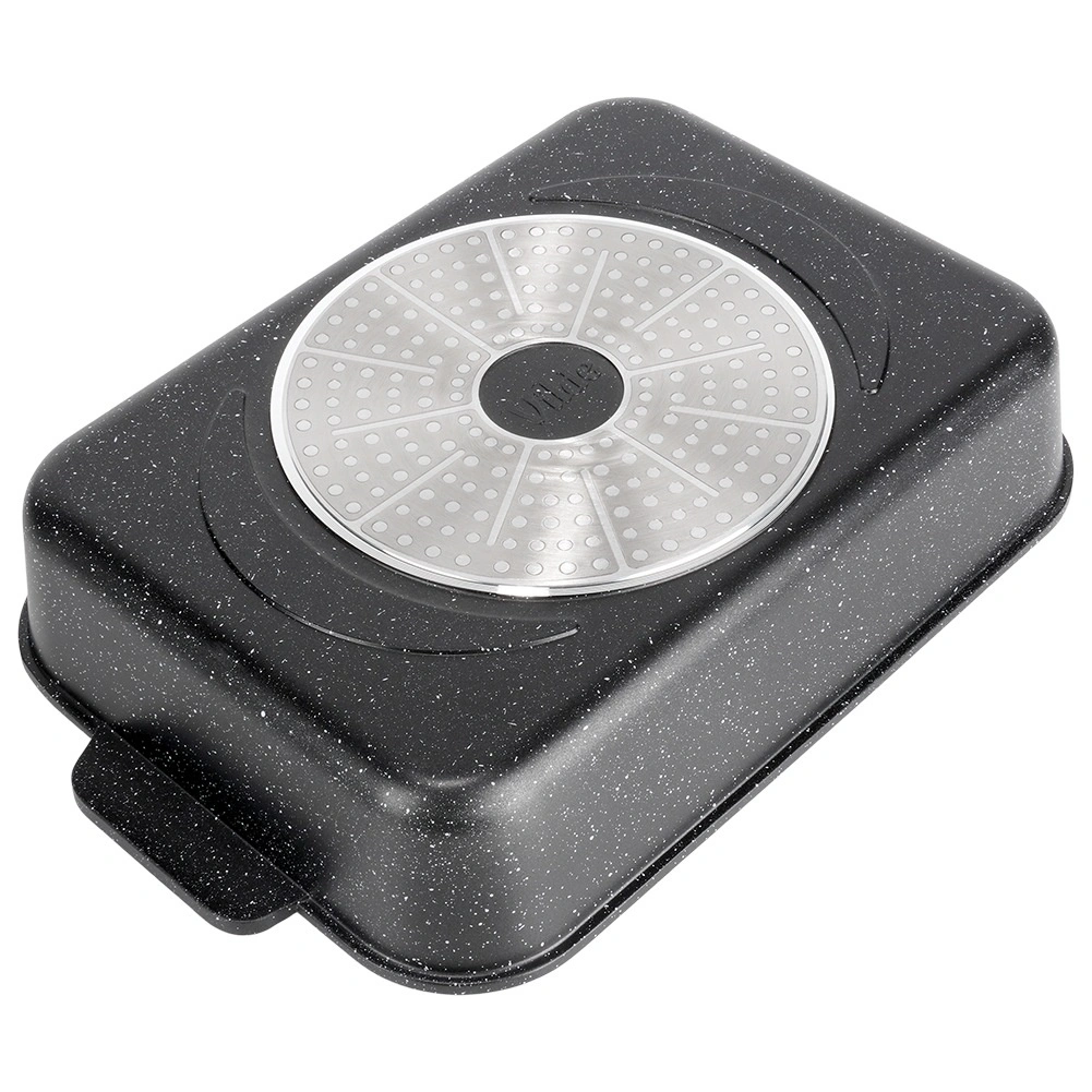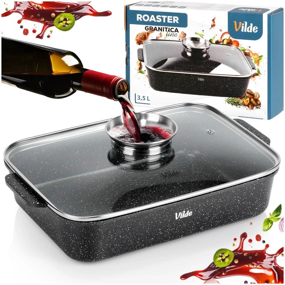 Tava dreptunghiulară din aluminiu turnat sub presiune, cu strat antiaderent din granit rezistent, distribuie uniform căldura și menține mâncarea caldă mai mult timp. Capacul din sticlă cu supapă de abur și dozator integrat pentru lichide aromatizante permite adăugarea de apă sau vin fără deschidere, astfel încât preparatul își păstrează suculența și aroma.