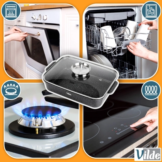 Tava este ideală pentru carne, legume, gratinuri și mâncăruri la oală. Datorită compatibilității cu gaz, electric, vitroceramic și inducție și rezistenței până la 250 °C (cu capacul din sticlă până la 220 °C), face față gătitului versatil de pe plită până în cuptor. Mânerele robuste facilitează manipularea în siguranță, iar după utilizare vei aprecia curățarea ușoară în mașina de spălat vase.