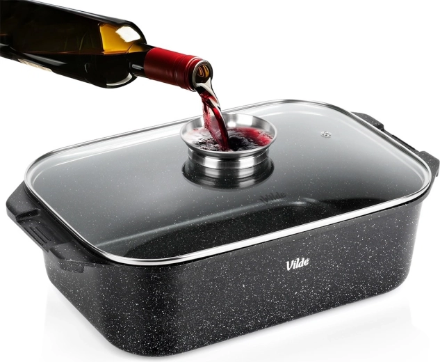 Datorită dozatorului de lichide din capac, în timpul coacerii puteți completa cu supă, vin sau marinadă fără pierderi inutile de căldură. Mânerele integrate facilitează manipularea, iar fundul rezistent este potrivit pentru cuptor și toate tipurile de plite, inclusiv inducție. Tava rezistă până la 250 °C (cu capacul din sticlă până la 220 °C).