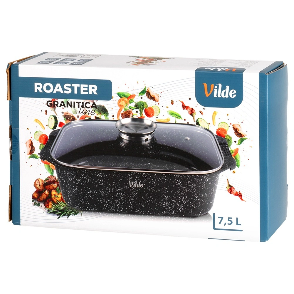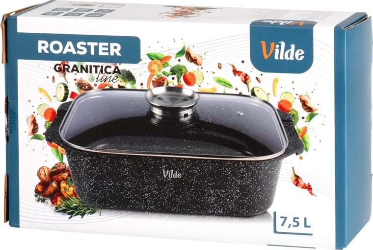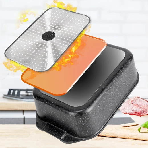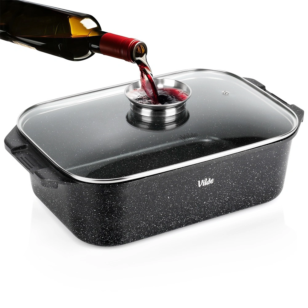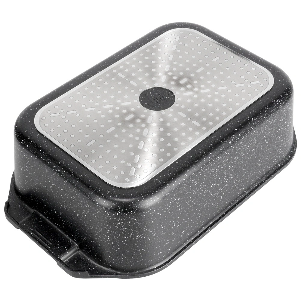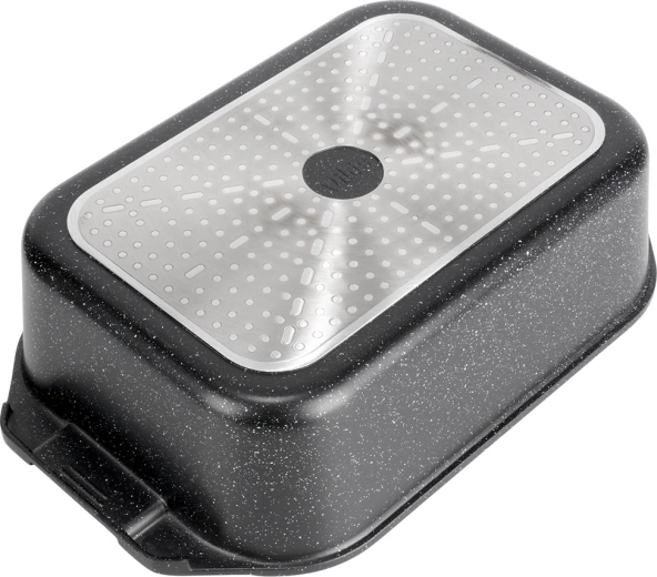 Tavă de copt spațioasă din granit cu volum de 7,5 l, cu capac din sticlă termorezistentă, ideală pentru coacere, înăbușire și gratinare. Corpul durabil din aluminiu turnat, cu strat antiaderent din granit, permite gătirea cu minim de grăsime, acumulează excelent căldura și menține preparatele calde mai mult timp. Capacul cu dozator integrat permite adăugarea de apă, vin sau condimente lichide fără a-l ridica.