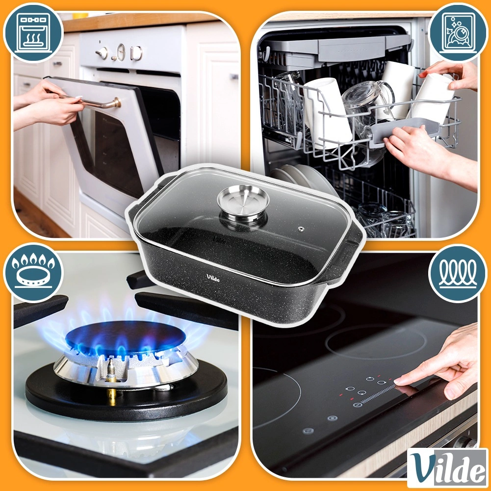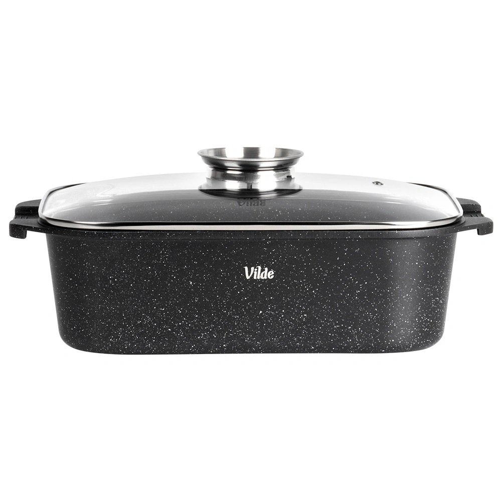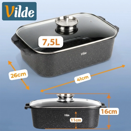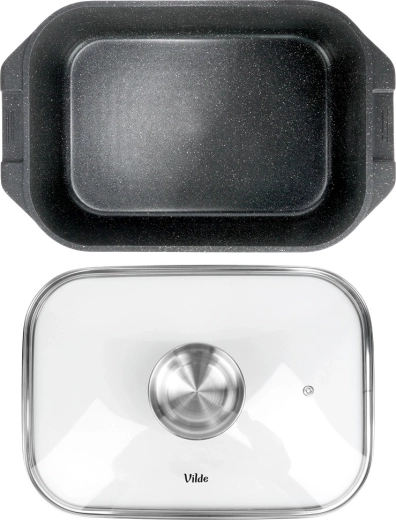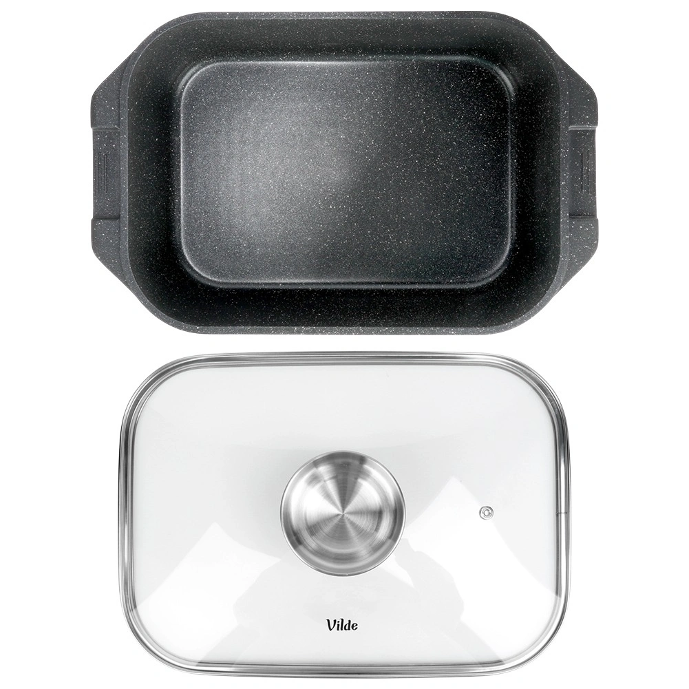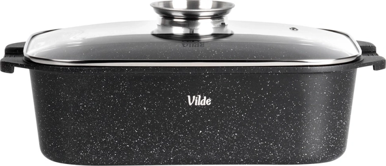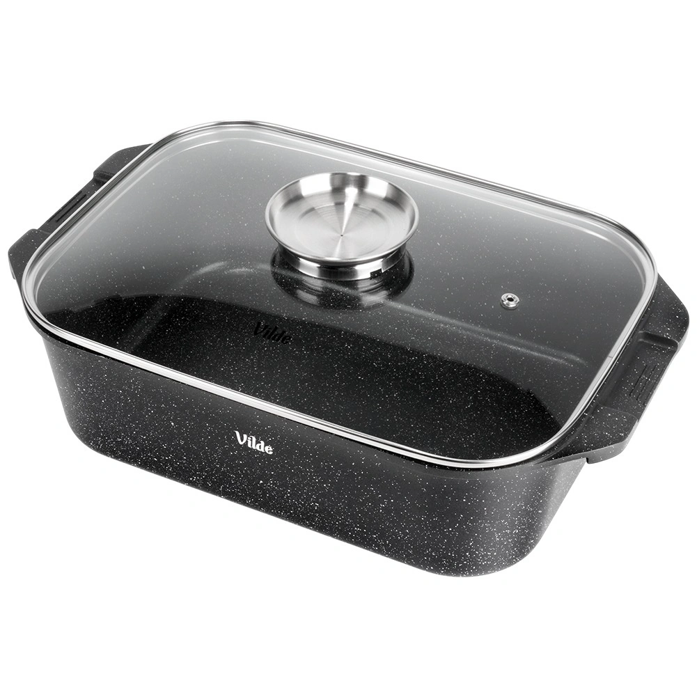 Tavă universală cu dimensiuni de 41 × 26 × 16 cm (înălțimea vasului fără capac 11 cm), un ajutor de nădejde pentru gătitul zilnic. Turnarea robustă din aluminiu cu strat granit antiaderent asigură distribuție uniformă a căldurii și eliberarea ușoară a preparatelor. Capacul din sticlă este termorezistent și permite controlul comod al gătirii.