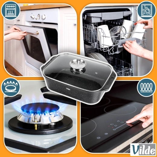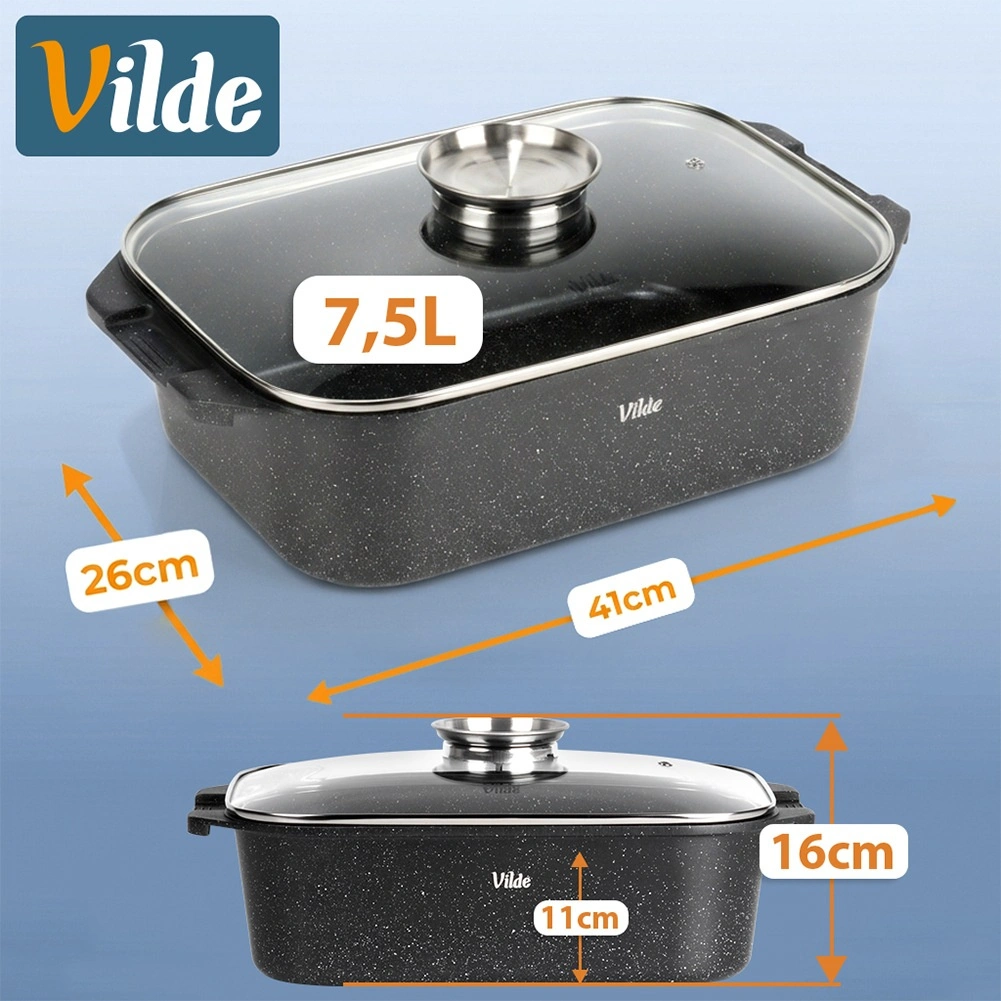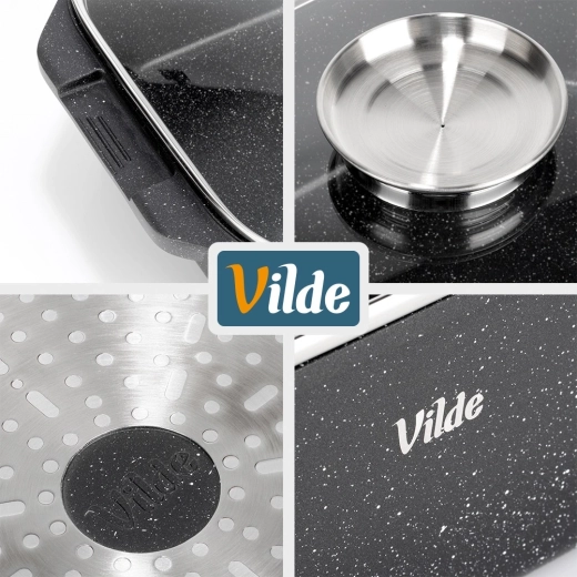 Întreținere ușoară și durată de viață îndelungată: suprafața de calitate reduce lipirea, iar întregul set poate fi spălat în mașina de spălat vase. Produs original al mărcii VILDE din linia GRANITICA LINE, fabricat conform standardelor europene.