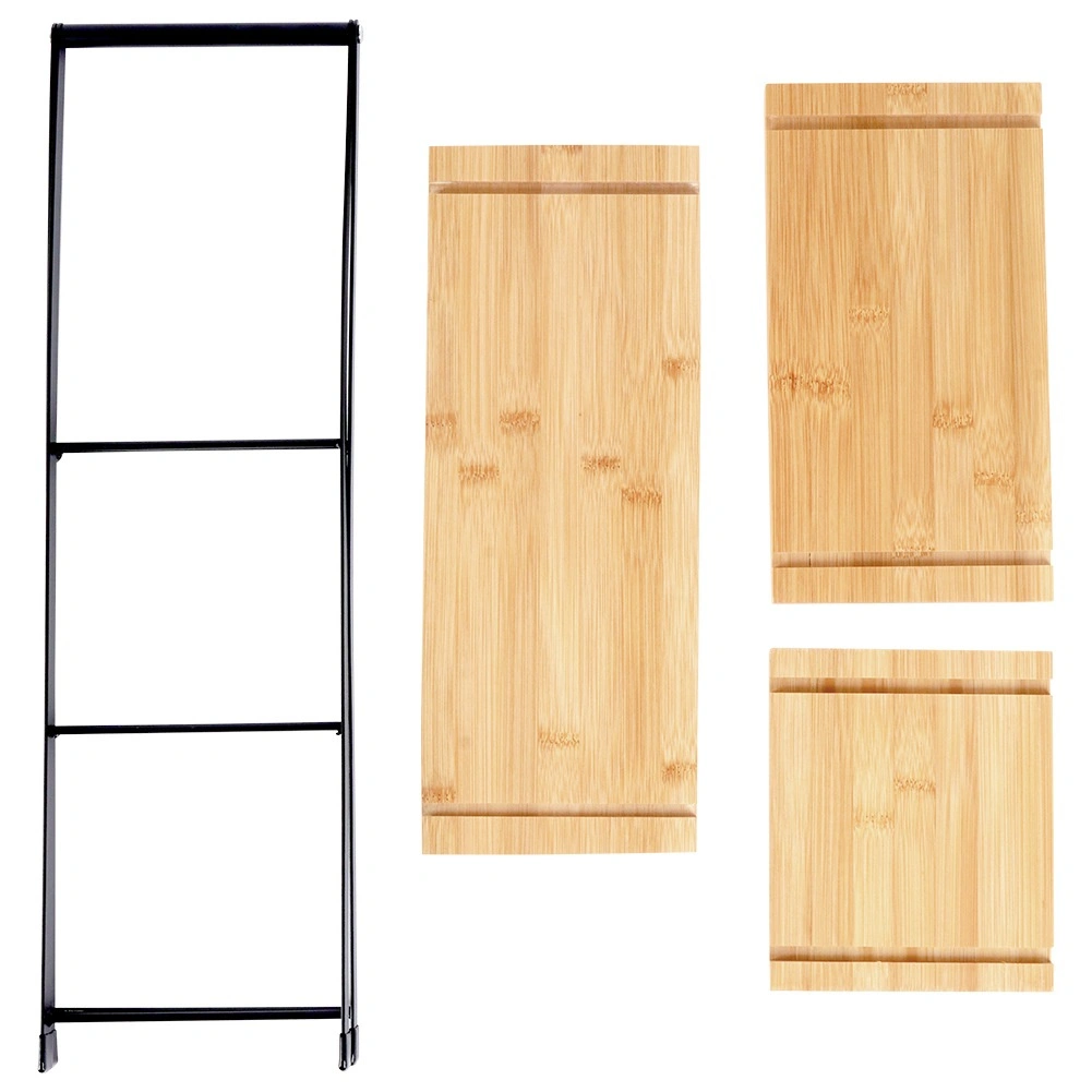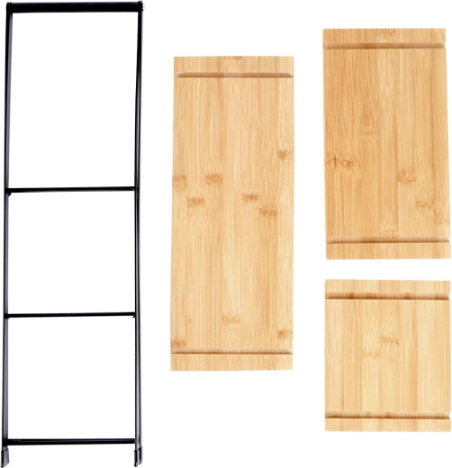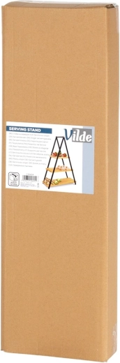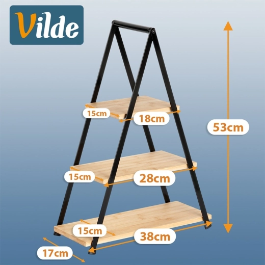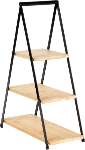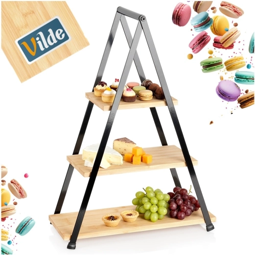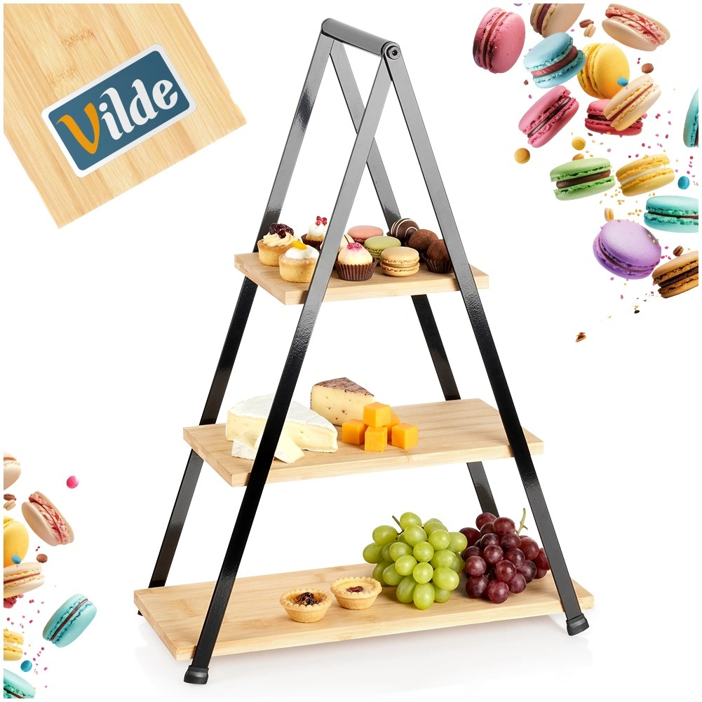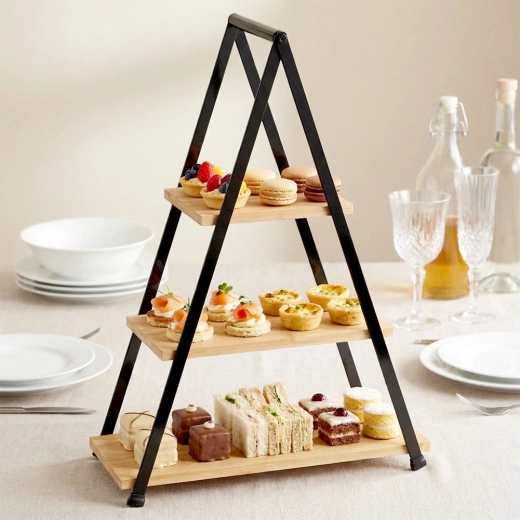 Etajera elegantă cu trei niveluri, înălțime 53 cm, este ideală pentru servirea și expunerea de deserturi, fructe, canapele și aperitive. Combinația dintre lemn de bambus natural și cadru metalic robust în culoare neagră asigură stabilitate, durabilitate și un aspect stilat pe orice masă. Datorită construcției pliabile, se transportă și se depozitează ușor.