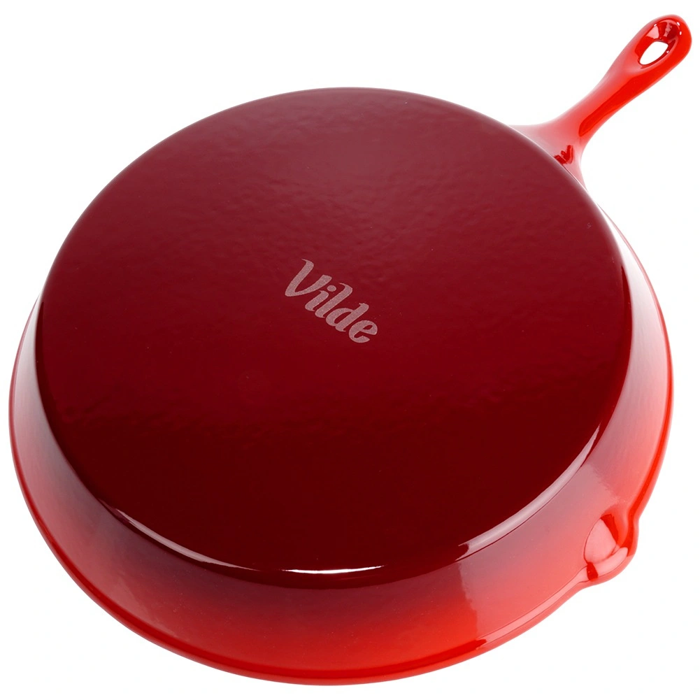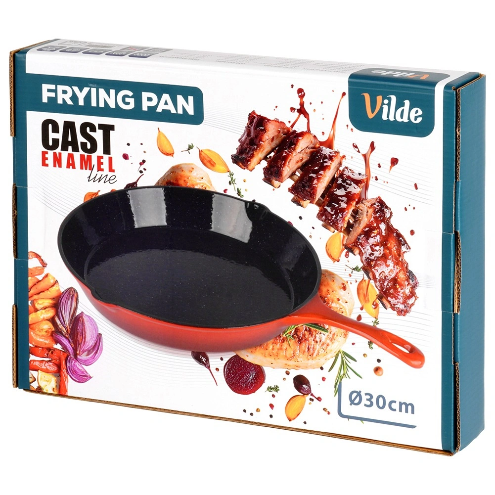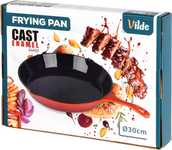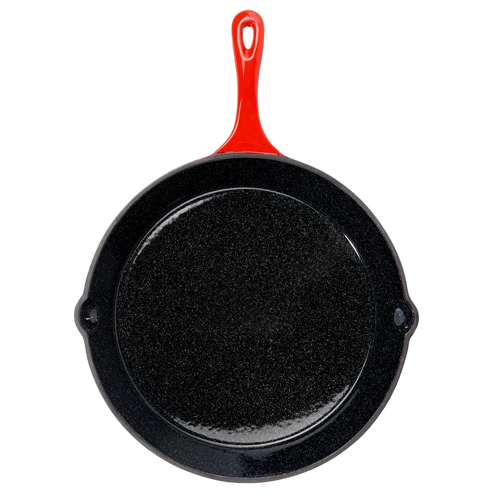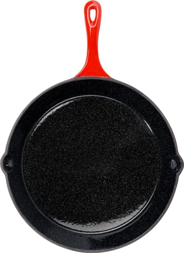 Tigaie robustă din fontă 30 cm cu interior emailat negru, două guri de scurgere și manșon din silicon roșu pentru mâner pentru transport în siguranță. Conducere și acumulare excelentă a căldurii pentru prăjire, înăbușire și gratinare uniforme pe aragaz, grătar și în cuptor. Potrivită pentru gaz, electric, vitroceramică și inducție.