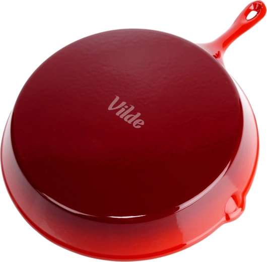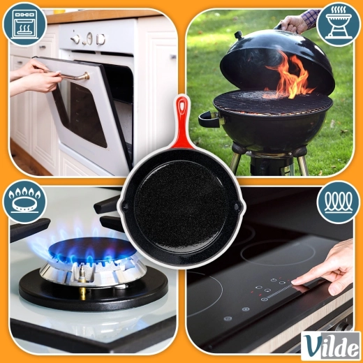 Pachetul include un manșon din silicon roșu pentru mâner, pentru prinderea în siguranță a tigăii fierbinți. Tigaia este rezistentă la temperaturi înalte și ideală pentru prăjire, înăbușire, coacere și gratinare – pe aragaz, direct deasupra focului, pe grătar și în cuptor. Orificiul de la capătul mânerului permite agățare practică.