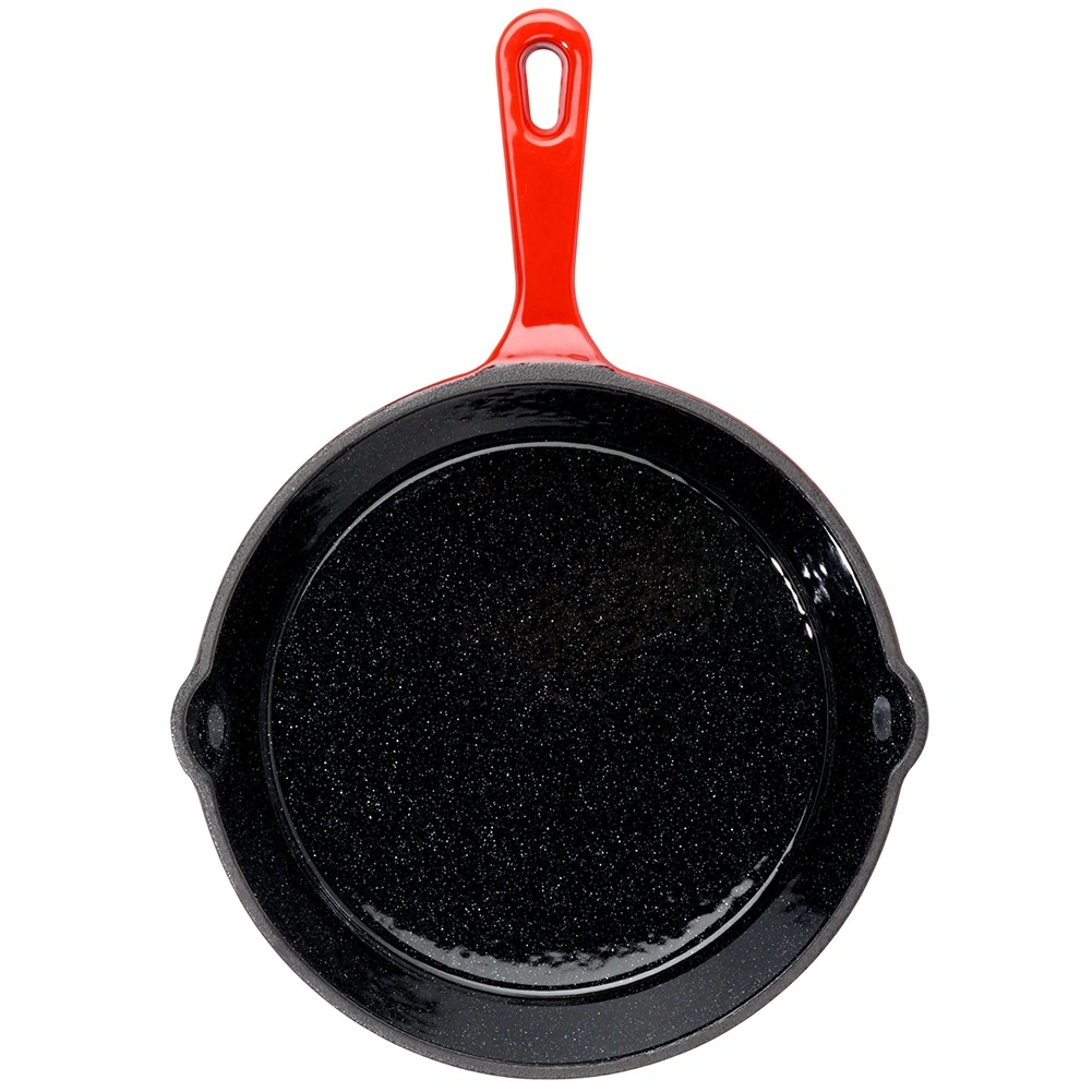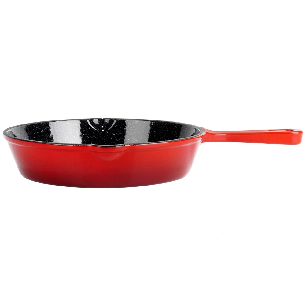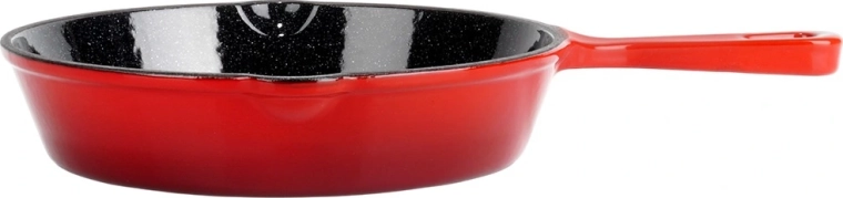 Tigaie universală din fontă, cu diametrul de 20 cm, cu interior negru emailat și exterior roșu emailat, oferă încălzire rapidă și uniformă, retenție îndelungată a căldurii și două ciocuri de turnare practice pentru scurgere ușoară. Include mânecă din silicon pentru mâner pentru manipulare sigură. Potrivită pentru gaz, electric, ceramic și inducție, precum și pentru cuptor.