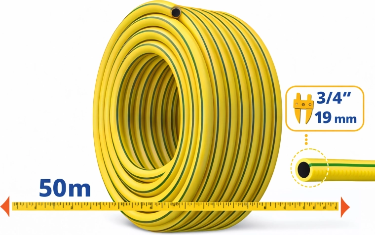 Acest furtun ranforsat cu 3 straturi oferă un echilibru optim între flexibilitate și durabilitate. Diametrul de 3/4" asigură un debit mare de apă, în timp ce materialul de calitate rezistă la îndoire și răsucire. Datorită culorii galben intens, furtunul este ușor vizibil pe gazon.