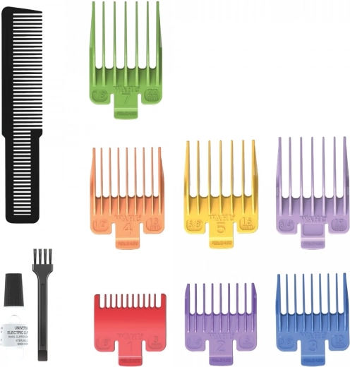 Lungimea precisă este asigurată de maneta reglabilă cu trei poziții (0,8 mm, 1,5 mm, 1,8 mm) și de 7 piepteni-ghidaj colorați (3, 6, 10, 13, 16, 19, 22 mm). Datorită motorului puternic, cu turație înaltă, aparatul este ideal pentru blană scurtă și netedă și pentru retușuri fine ale blănii de lungime medie.